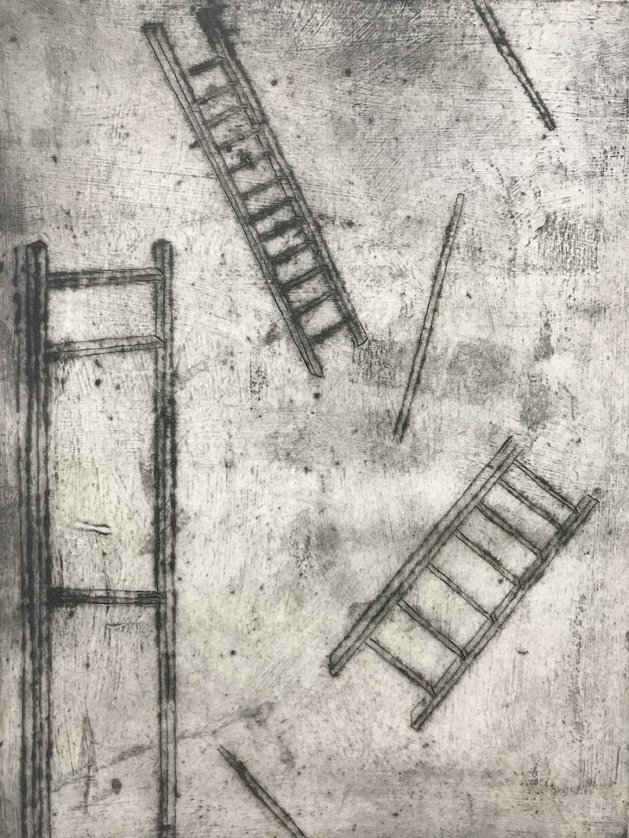 Acclaimed painter and printmaker Greg Fletcher presents a solo exhibition of monoprints and drypoints created during the pandemic at Ink Spot Press.  A native of Baltimore, Fletcher has been transforming the stories, memories, and figures of this city into his evocative artwork for decades.“For a well-conceived, creative work of art in Baltimore, art patrons and collectors would do well to explore the art of Greg Fletcher. Born and raised in East Baltimore, Fletcher captures the essence of the Baltimore community in which he still lives. His position in the community enables him to offer an expressionistic look into the Baltimore landscape, people, and events. Historically, the city of Baltimore has gone from communities with vibrant streets lined with beautiful row houses, to a city in decay, to its current revitalization. This backdrop provides Fletcher with his artistic inspiration. He does not see the ugliness of those communities. Instead, he sees the beauty of their past as he remembers them. By portraying buildings leaning, somewhat like those in William Johnson’s works, Fletcher brings new life into his paintings. In addition to painting structures and cityscapes, Fletcher also portrays figures, in both charcoal and sculpture.