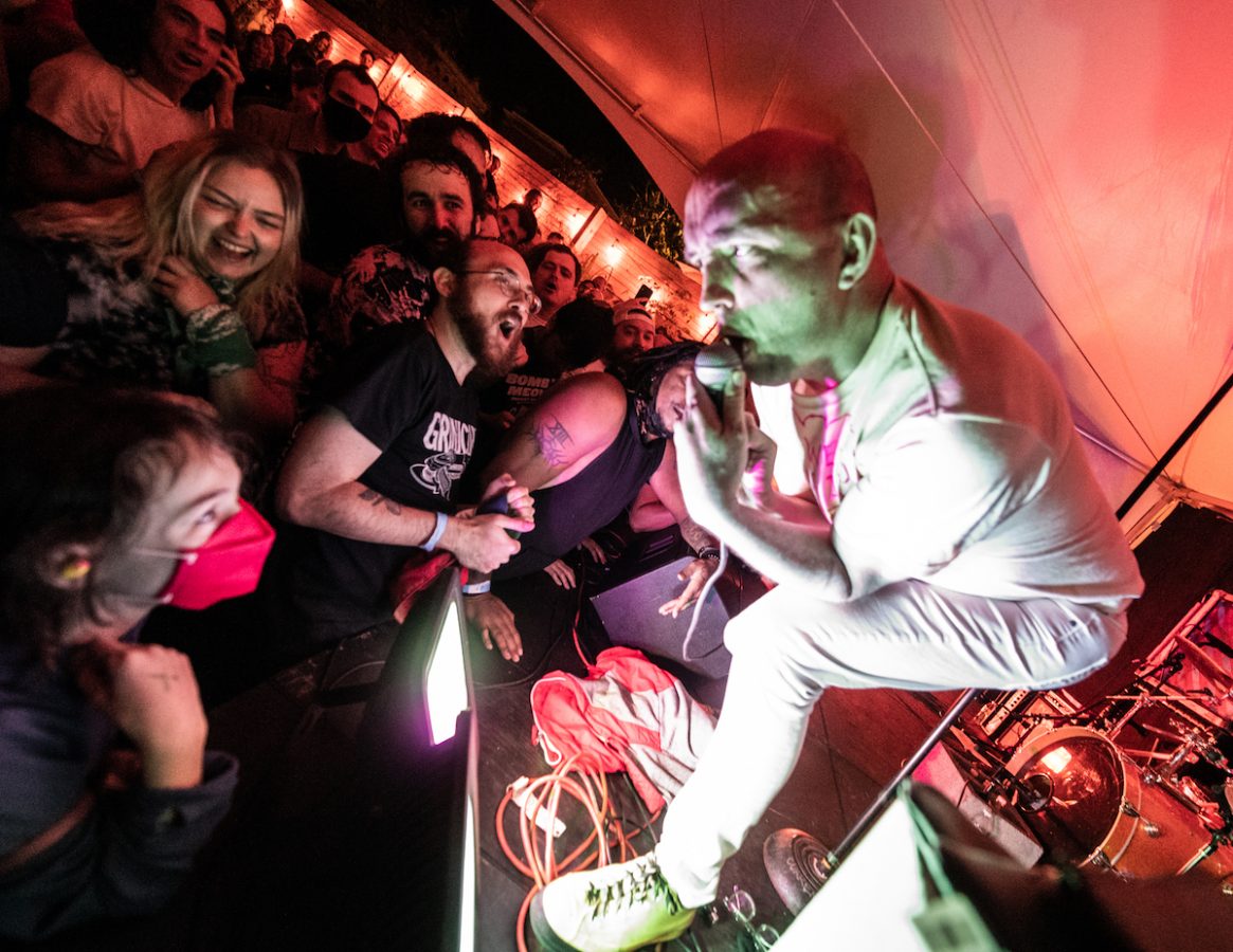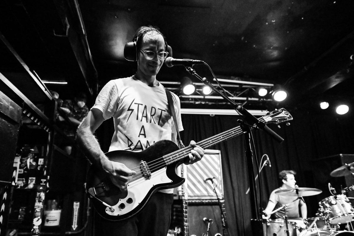 An unusual opening for a rock show: A muscular man walks onto the stage and leads the audience in a group warm-up exercise that mimics the atmosphere of being at a gym. I was expecting Double Dagger’s live show at Current Space to be somewhat fiery-spirited punk, yet somehow the workout activity gave it an incandescent, joyous and vibrant positive energy.