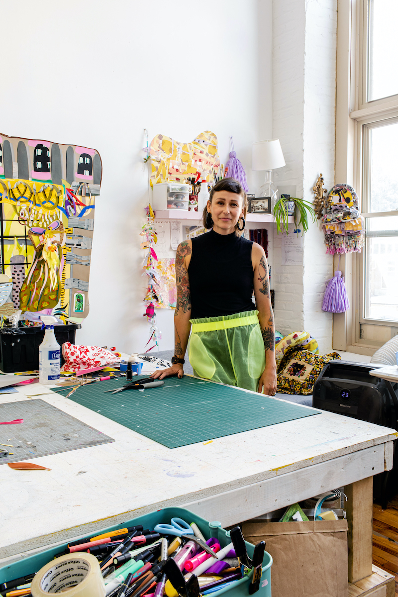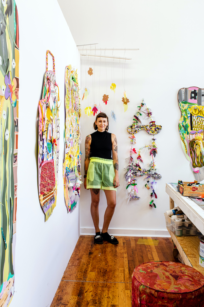 A fixture at art openings around town since she moved to Baltimore to attend Towson’s MFA program in 2008, Boone-McCreesh’s fashion is always vibrant and often involves neon paired with fun sneakers. A friend told Boone-McCreesh that she does the opposite of the famous Coco Chanel quote, putting on one more thing before leaving the house instead of taking it off. Knowing this, it’s no surprise that her introduction into art-making was through fashion, and that, growing up in rural Pennsylvania, she made her own fashion books alongside her sister, Nichole Beard, with whom she still collaborates on her artist interview series INERTIA (Beard is the transcriber). INERTIA came out of Boone-McCreesh’s extroverted tendency to connect with other artists and learn about their studio practices. Laughing, she reveals that interviewing other artists has confirmed her suspicion “that yes, we do all have the same problems.” As another artist-interviewer, I cosign this assessment.
