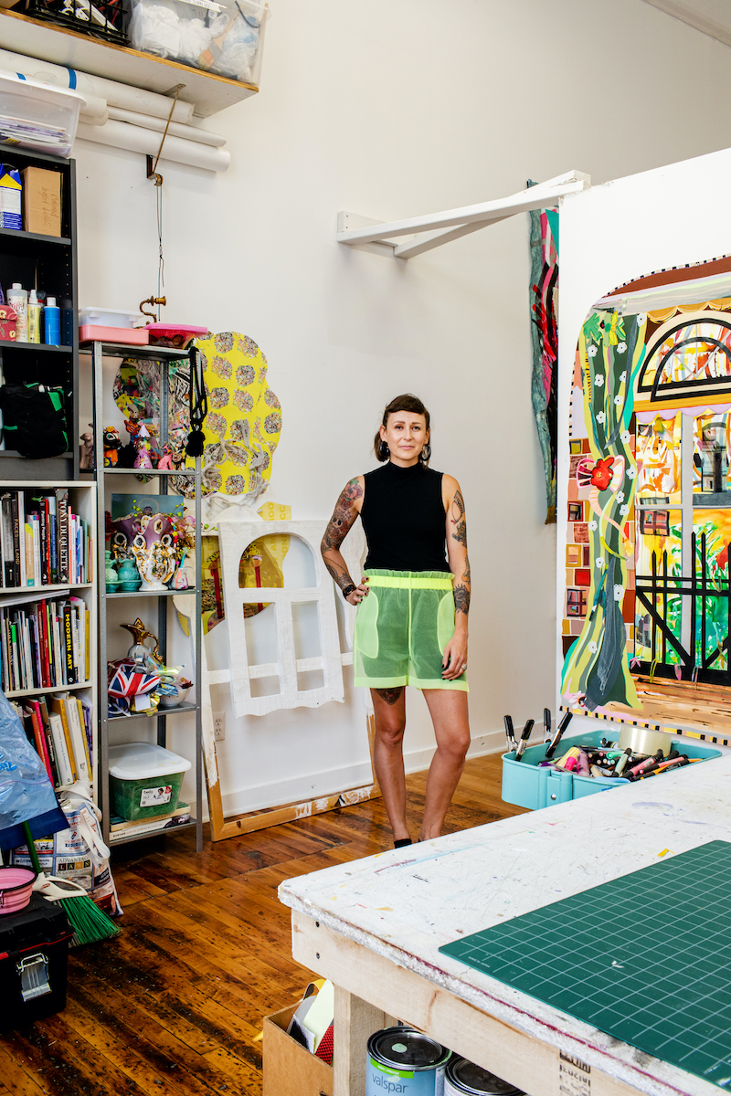 When she’s not in the studio or out in the community interviewing artists, Boone-McCreesh is a hard-working adjunct professor, currently serving as a senior-thesis advisor in MICA’s GFA and painting departments. In her studio, we chatted about the challenges of the shift from online learning back into the classroom last fall. Boone-McCreesh sees herself as a facilitator for her students. “I hope that part of my impression as a teacher is that if a student is having issues, [our shared goal] is to figure out the skills or ways to work around their issues, even if they have nothing to do with me,” she says. “What can we do to make this work? What are you excited about? If one person believes in them, it could mean a lot. I don’t know what their life is like. In the beginning [when I first started teaching college in 2011,] I was such a hard-ass and now I’m much more empathetic.”