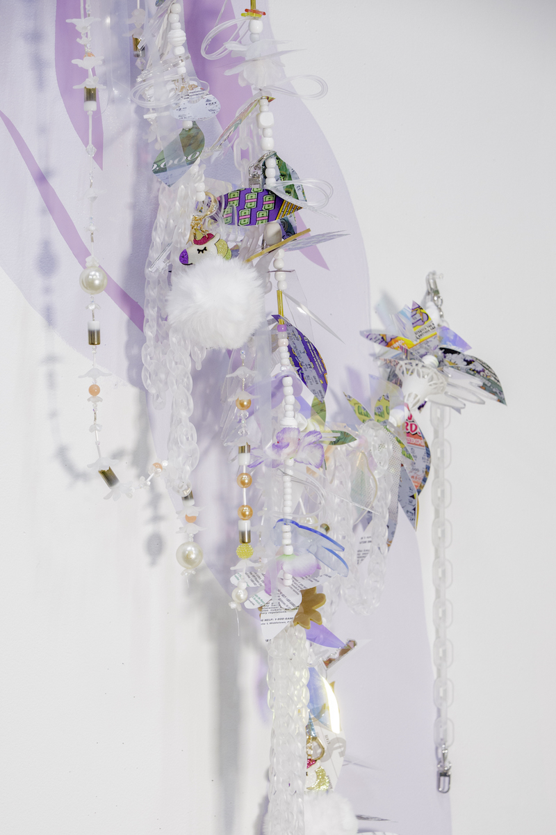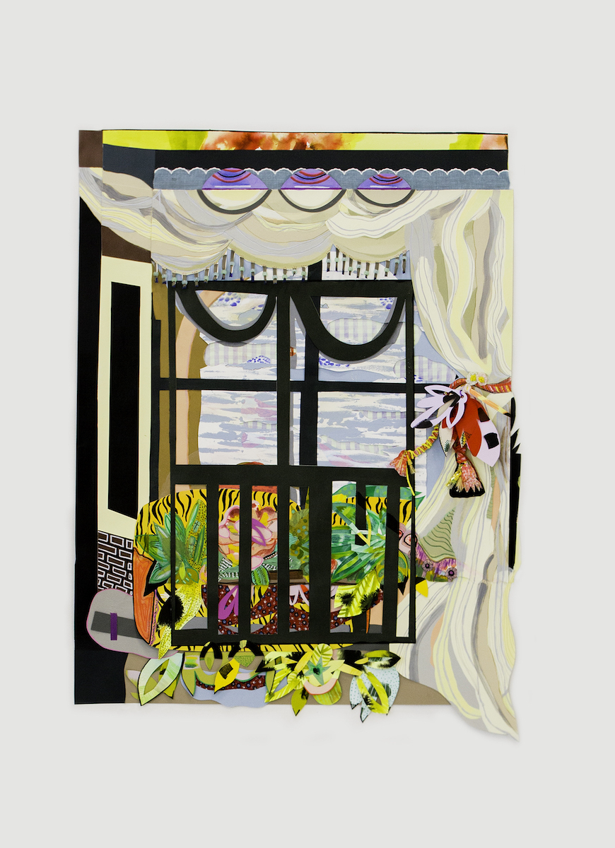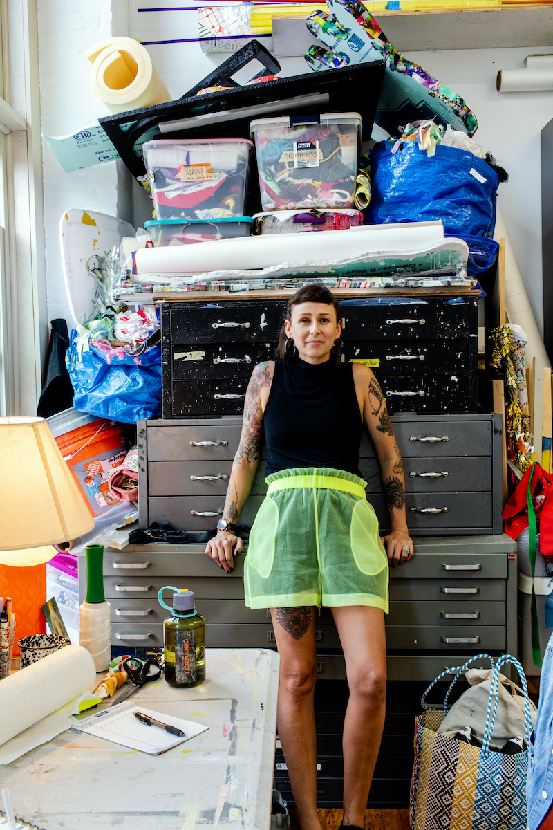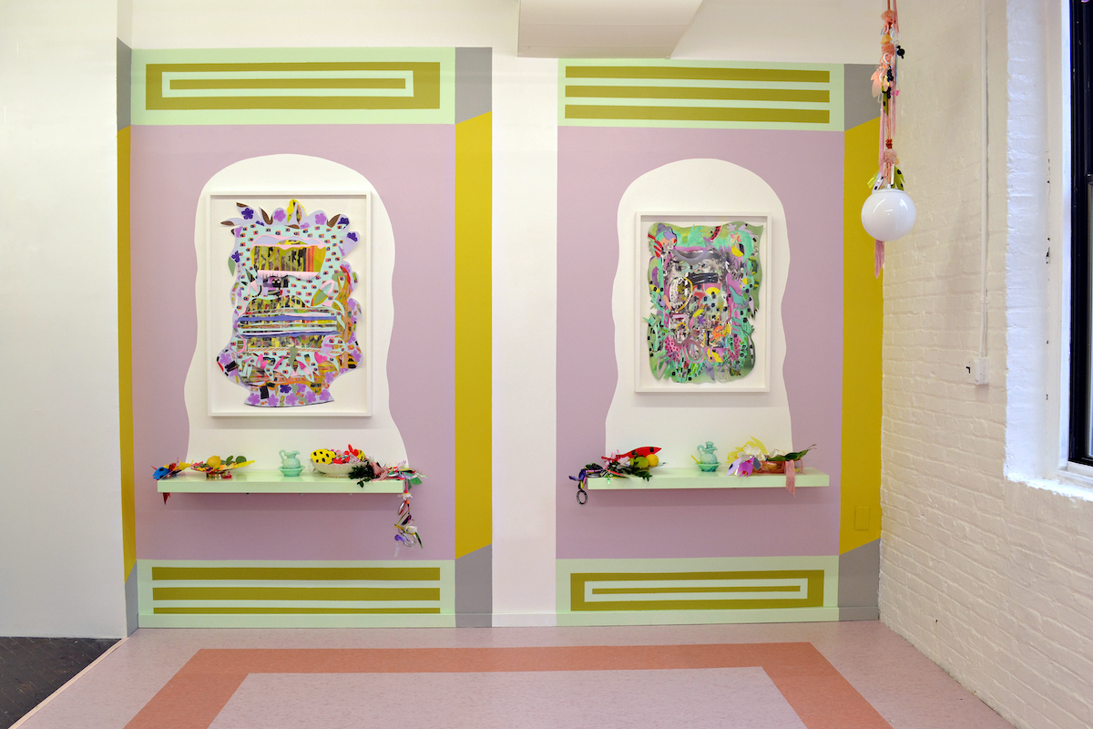To maximize the walled-off section—not much larger than 15 by 15 feet—of the studio space she shares with artists Alex Ebstein and Jackie Milad, Boone-McCreesh was methodical. Several large flat files are stacked high in a corner, and an assortment of works in progress hang on the two-and-a-half remaining windowless walls. A cutting table is pushed against one working wall, and the final wall with the window has a couch under it where I, and sometimes Zeke, sat during the interview, one of us angling for a belly rub. On the floor, co-mingling with an assortment of dog toys, are colorful scraps of plastic and cut paper and something that glitters in the light, materials the artist uses in her work. In people’s studio spaces I am used to feeling their aesthetic strongly, but in this instance, with very little effort, it felt like Boone-McCreesh encased me in bright plastic.
