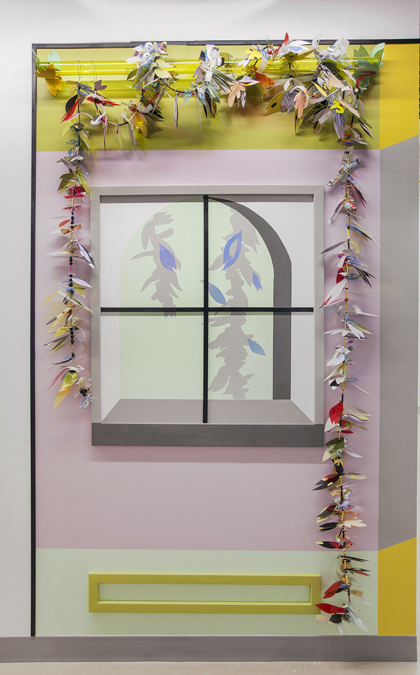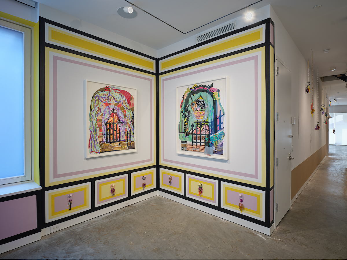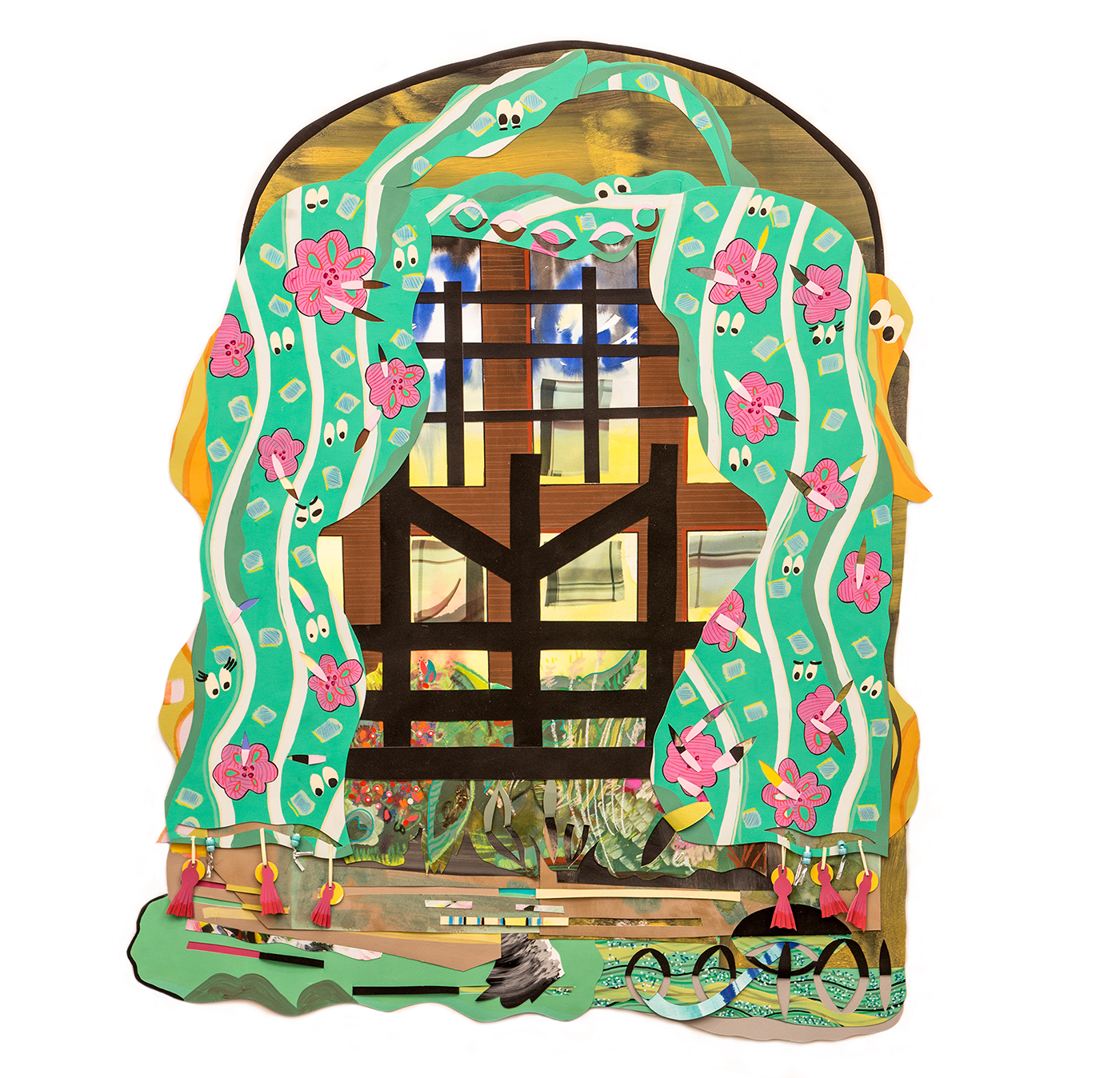 To maximize the walled-off section—not much larger than 15 by 15 feet—of the studio space she shares with artists Alex Ebstein and Jackie Milad, Boone-McCreesh was methodical. Several large flat files are stacked high in a corner, and an assortment of works in progress hang on the two-and-a-half remaining windowless walls. A cutting table is pushed against one working wall, and the final wall with the window has a couch under it where I, and sometimes Zeke, sat during the interview, one of us angling for a belly rub. On the floor, co-mingling with an assortment of dog toys, are colorful scraps of plastic and cut paper and something that glitters in the light, materials the artist uses in her work. In people’s studio spaces I am used to feeling their aesthetic strongly, but in this instance, with very little effort, it felt like Boone-McCreesh encased me in bright plastic.