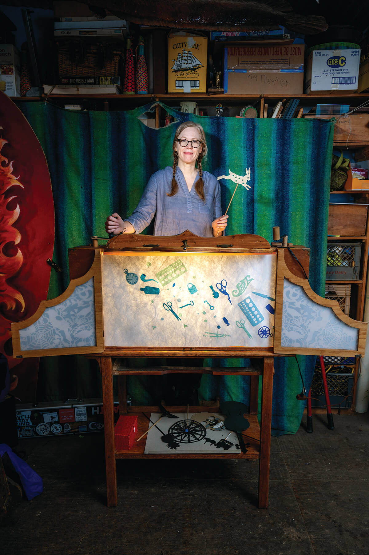 Suffice it to say, her papercuttings have become even more elaborate over the years. But it was the discovery of “crankies”—the 19th-century art form that combines storytelling and a hand-cranked scroll of illustrated images—that allowed her to integrate her work as a papercut artist, shadow puppeteer, and vocalist with her love of folk tales.