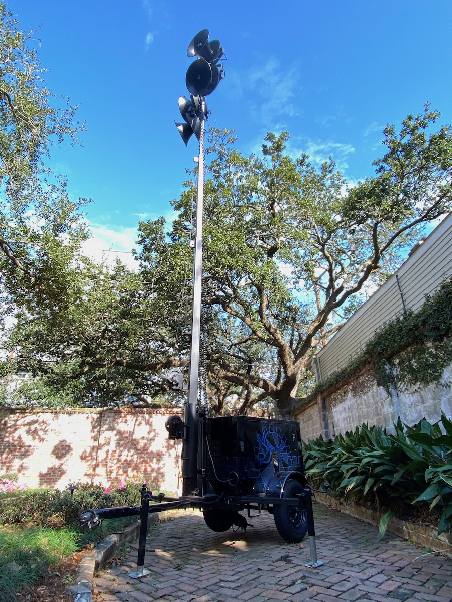 Battle Ground Beacon by Nari Ward is inspired by portable police floodlights, the sculpture projects a sound composition reworked from Ward’s contribution to Prospect.1, including the voices of Malcolm X, Martin Luther King Jr., James Baldwin, Amiri Baraka, Shirley Chisholm, Cornel West, Amanda Gorman, and Buddhist chanting by Tina Turner.