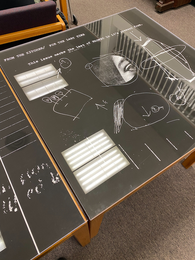 Kameelah Janan Rasheed’sFuture Forms is inspired by the final issue of Nkombo, a New Orleans-based Black literary magazine (1968-1974) housed in the archive. The work is installed on the surface of the research center’s reading tables.