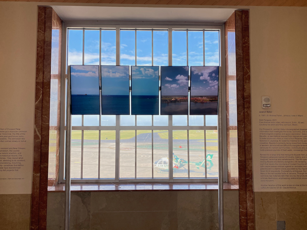 This two-channel video installation, Bulk Pangaea by Jamilah Sabur, is named after a cargo ship that transports bauxite (a material used to make aluminum) from Jamaica to Louisiana, highlighting the social and environmental impact of the trade.