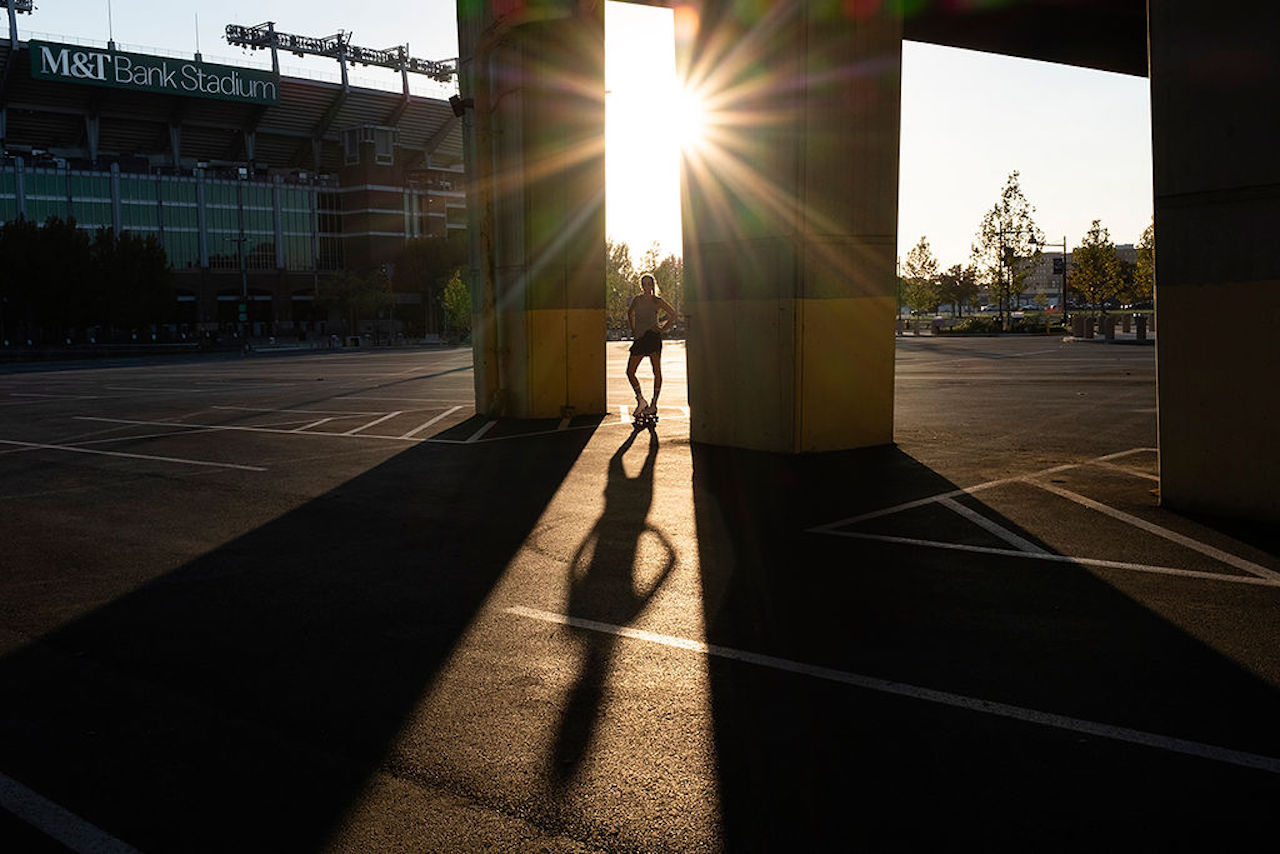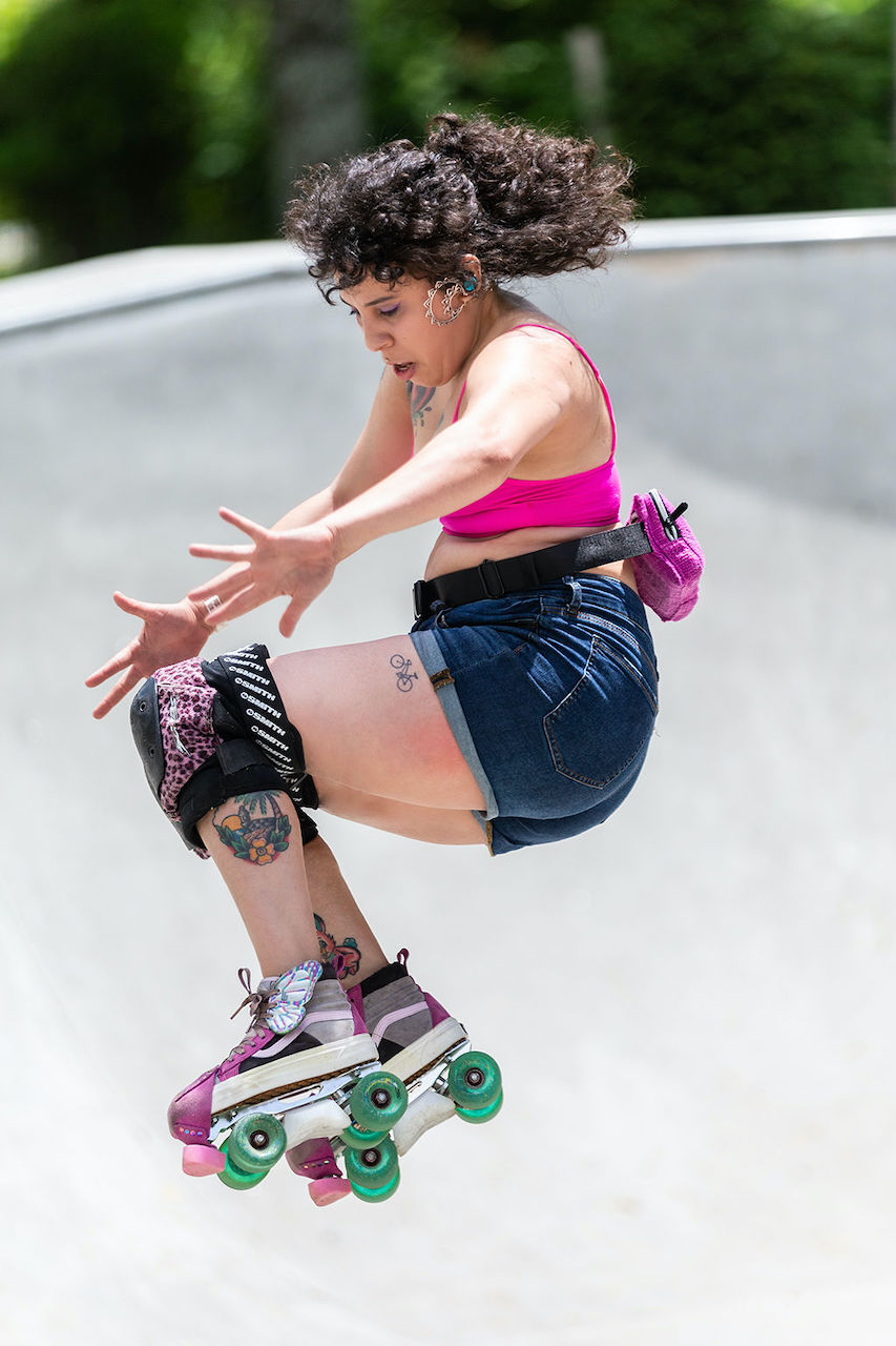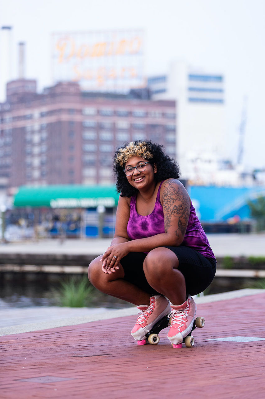 Capturing the city by including neighborhood landmarks became another goal for Robinson, who spent the earliest days of the pandemic shooting empty streets as an homage to home, with several images included in BmoreArt’s Issue 09. Robinson crisscrossed the city for popular skate spots, shooting at the Druid Hill tennis courts, the Ravens lot behind the Baltimore Museum of Industry, Lake Montebello, and a rooftop garage on Saratoga Street, among other locations. Forever tied to this communal moment of release after long isolation, the images function as both landscapes and portraits. And yet, the skaters themselves are boundless, embodying, for Robinson, the “escape from daily life” that coasting over pavement provides. While roller skating doesn’t erase the trials of the last twenty months, for herself and her subjects, “skating is way better than reality.”