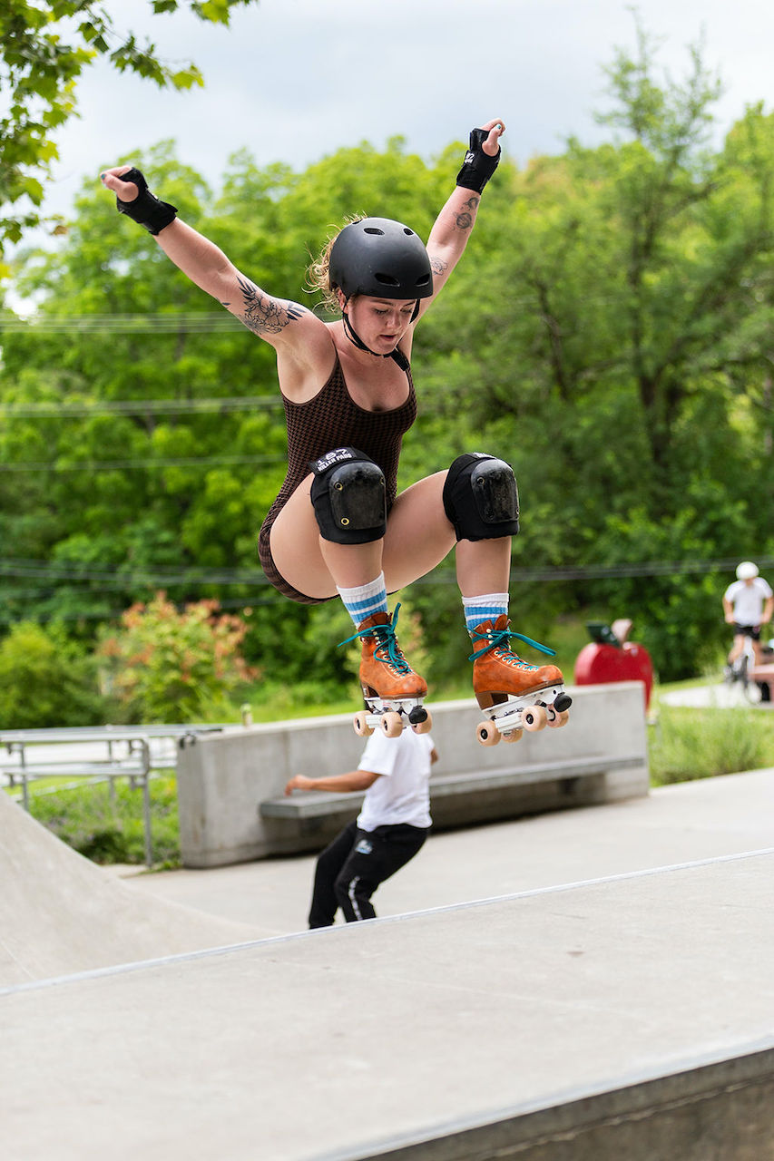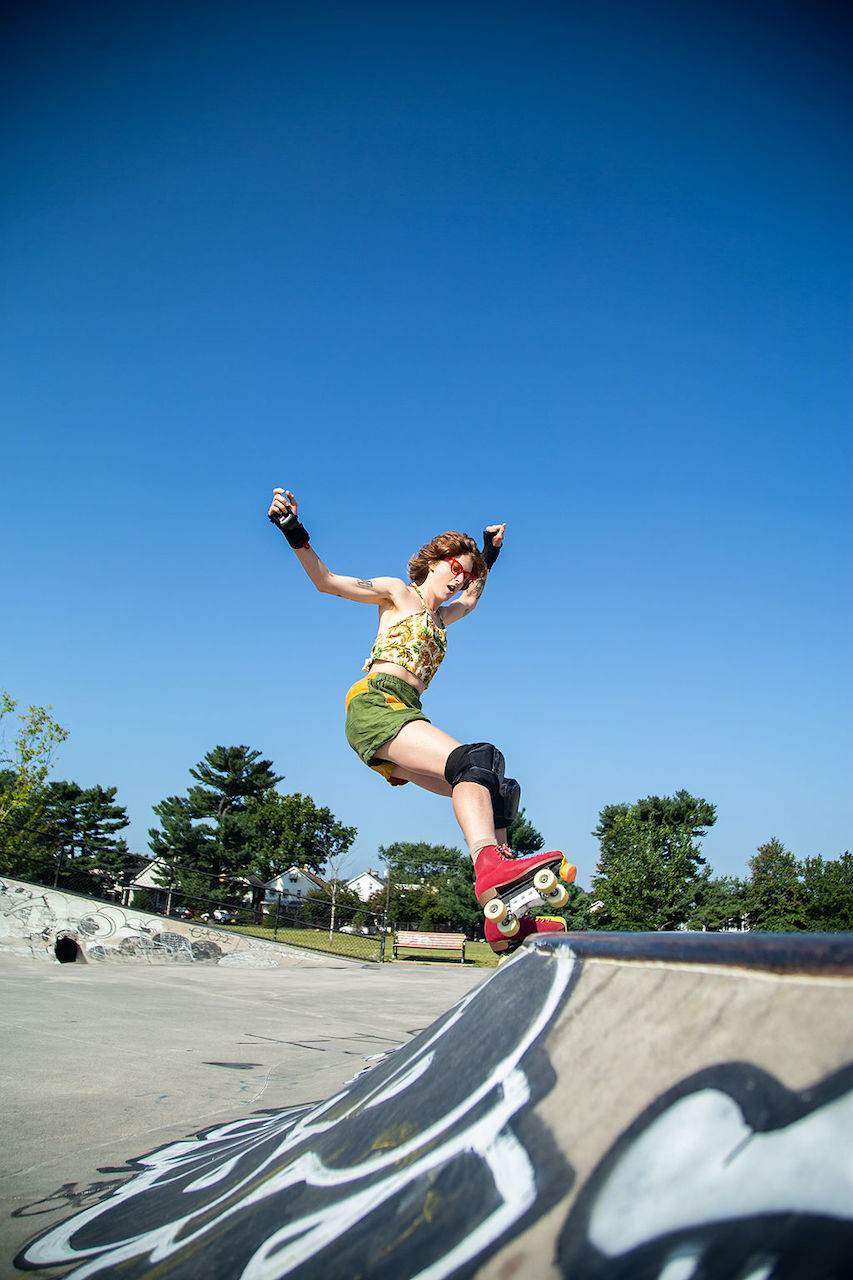 The closure of gyms and yoga studios during the COVID-19 pandemic presented an opportunity for the Baltimore-based photographer, who has always been an athlete, to return to skating. In July 2020, Robinson ordered a pair of Candi Grl skates—white with pink laces and pink wheels—online, citing a need to move. Remembering how empowered skating made her feel as a girl, she hit the streets, meeting up with friends and eventually a wider network of female-identifying Baltimore skaters.