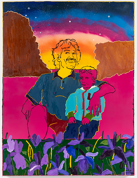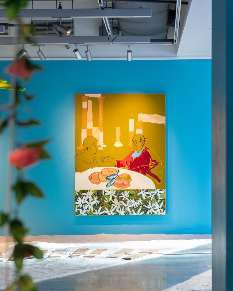 All of Eassa’s nuclear family members are depicted in his paintings including his paternal grandparents, Sito and Gido, each at a moment that stands firm in his memory. Each of these scenes of familial intimacy exists in a backdrop rife with symbols of the Levantine world and each with a bar of flowers across the bottom edge; Jasmine, Poppies, Red Roses and Tulips. In this exhibition, Eassa creates a new history for his family, where they get to exist in the Arab world they left behind so many years ago.