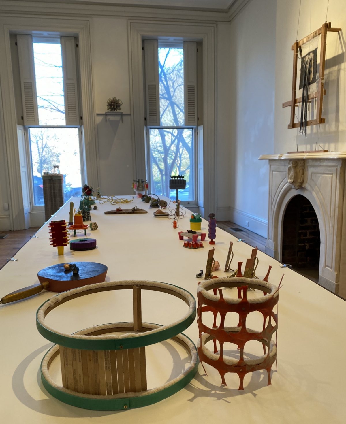 Arranged on a long white tabletop at Project 1628, the front room of a grand Bolton Hill brownstone, the artist’s creations engage in witty banter with new audiences but also with each another in an ideal setting. Titled Repartea—a riff on “repartee,” a conversation or speech characterized by quick, clever comments or replies, and teatime—Fisher’s dinner party installation unites the tiny assemblages into individual place settings at a lavish feast for the eyes and mind. On the walls, two-dimensional portraits of Fisher’s works reflect a sincere approach to surrealism, where objects are personified into fantastical but approachable entities. Additional sculptures adorn the corners, staircase, and marble mantlepiece, along with a beautiful printed catalog and sets of coasters available for sale.