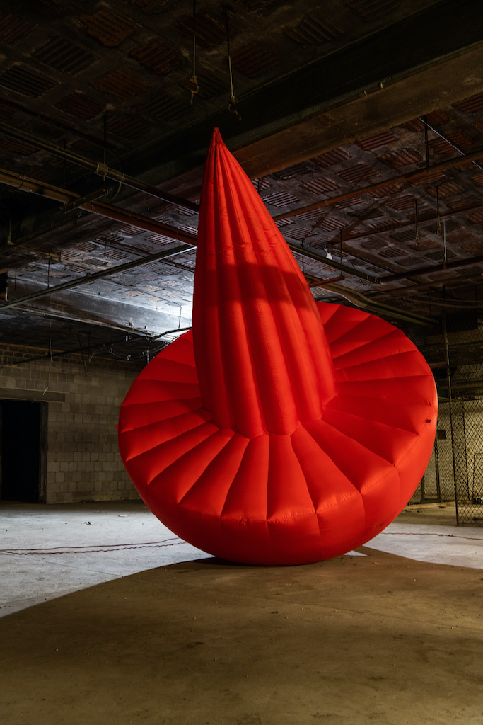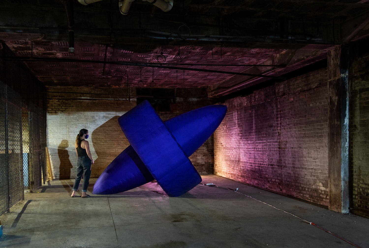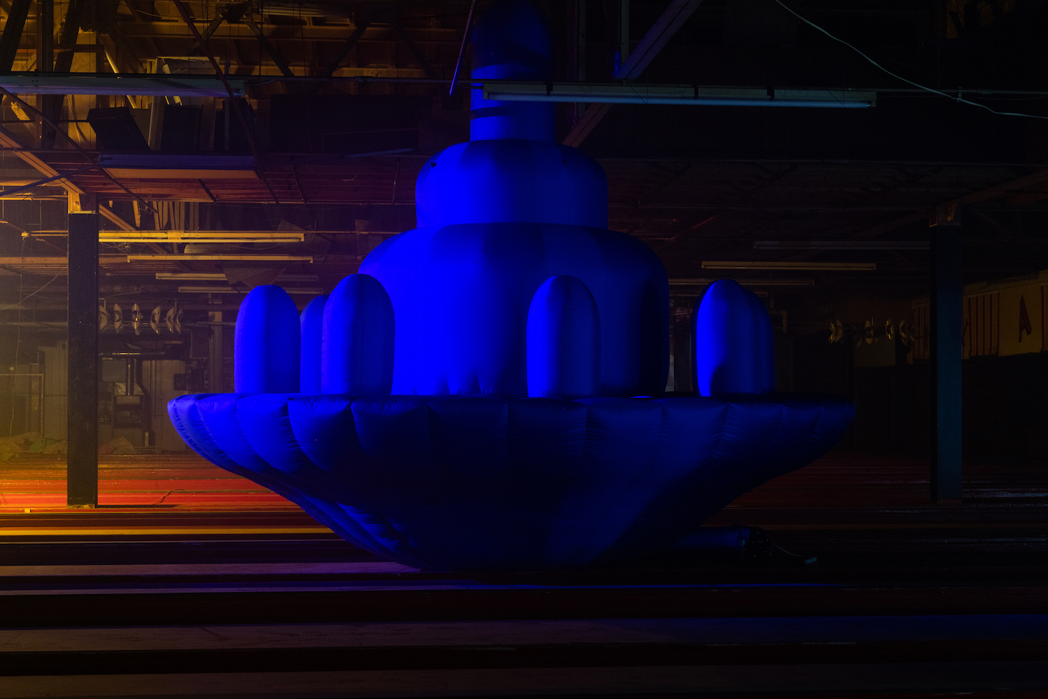 “You will never see this place again,” said TLaloC, urging viewers to document the ominously wonderous inner chambers of the North Avenue Market. On the final tour of the Baltimore artist’s latest solo show, Orbis Tertius: Hlaer to Jangr, a small group of us stood in the dark, abandoned bowels of the historic building. Caged stalls, electrical meters, and thick padlocked doors framed two of TLaloC’s fantastical sculptures: vibrant inflatable pieces that filled the space from floor to ceiling, gleaming like alien objects, their purpose and meaning inscrutable.