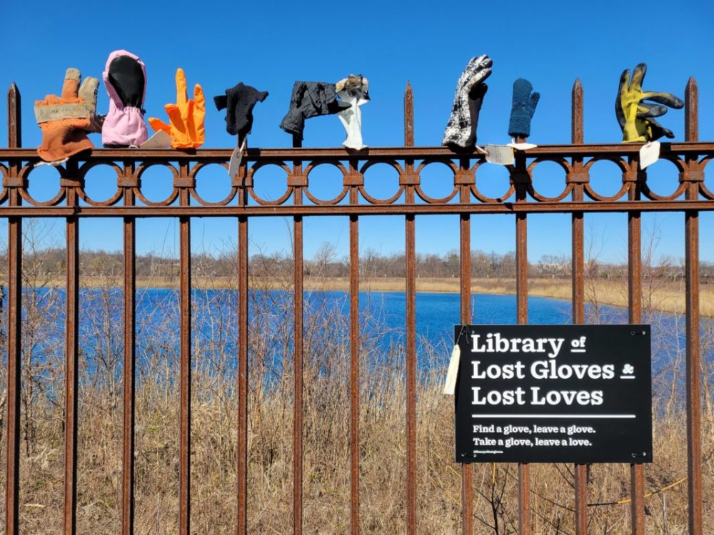 Gloves that were lost and later found have been turned into an art installation at Druid Lake, titled “Library of Lost Gloves & Lost Loves.” The articles range from kids’ mittens to adult utility gloves. Photo by Marcus Dieterle.