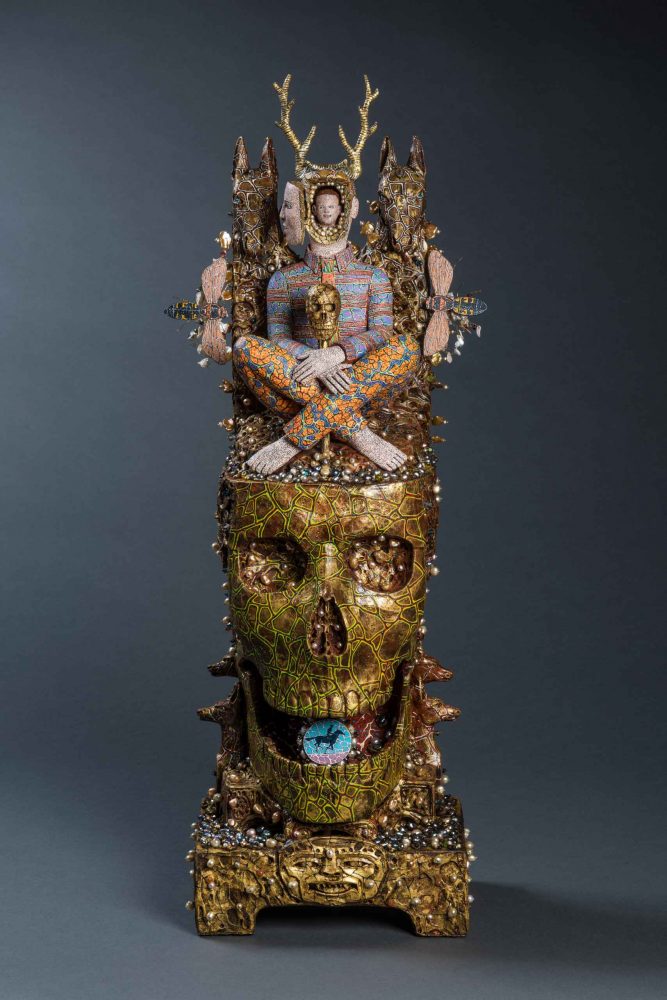 “My sculptures integrate ceramic, which is the primary medium, with wood, fresh water pearls, semi-precious stones, gold leaf, and oil paint,” Cleaver explained. “They are made complete with secret compartments which serve as hiding places for multiple, and often times personal meanings. My recent work is based on narratives drawn from personal and historical events that are overlapped with subconscious images.”