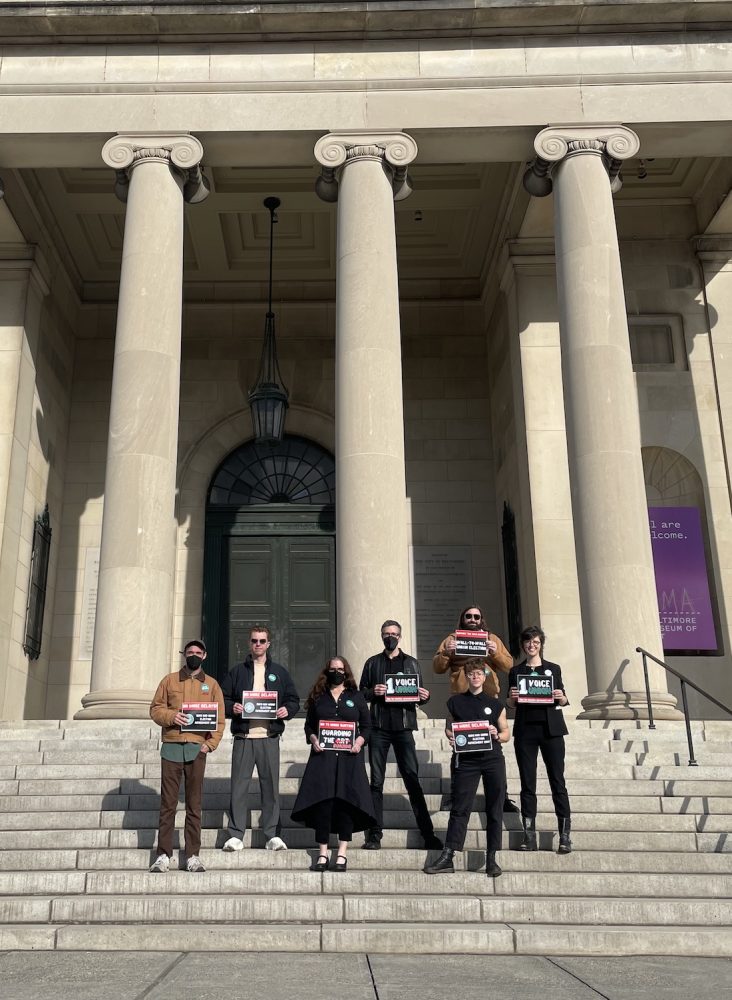 On Tuesday, March 22, a group of seven workers who are part of the ongoing effort to unionize the Baltimore Museum of Art held signs with slogans such as “1 Voice, 1 Union” and “No More Delays”; one sign had “Guarding the Art” changed to “Guarding the Guards.” They were demanding that the BMA’s director, Christopher Bedford, sign the union’s election agreement. Bedford, the union stressed, has had two months to sign the agreement, which is needed in order to allow a union election organized by the city.