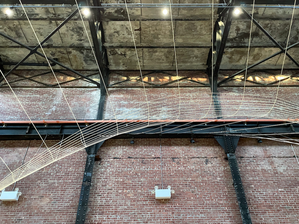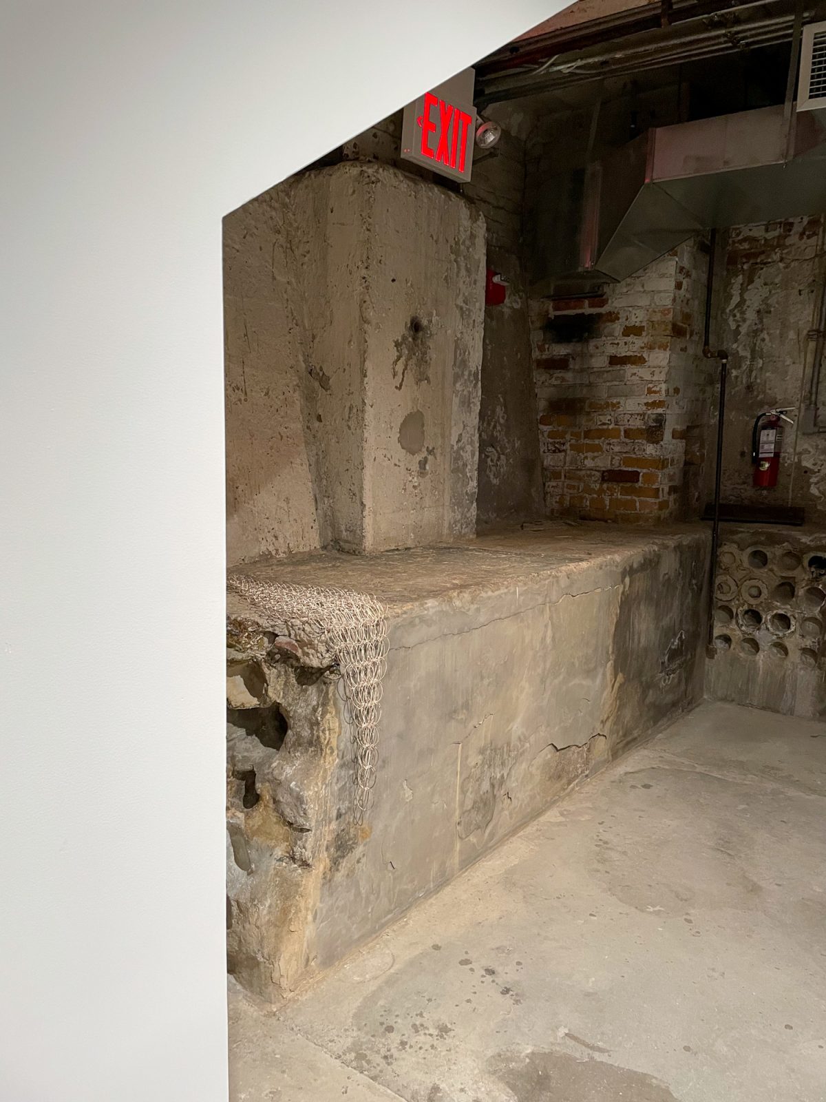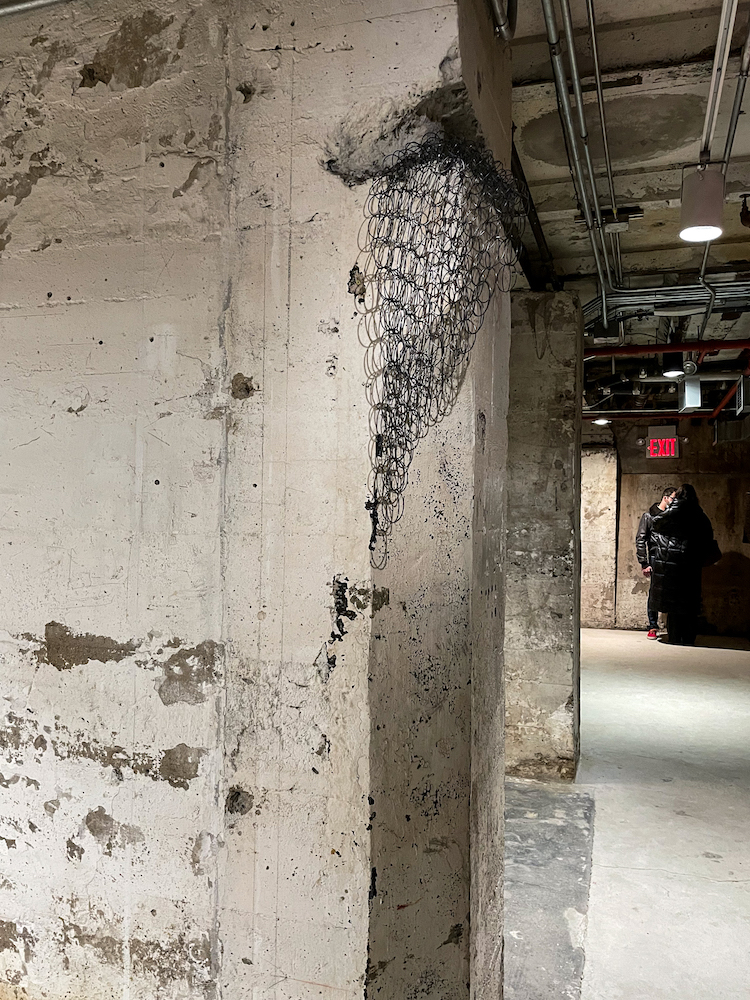 I approach the mechanical box affixed to the metal column near a corner in the gallery. Flick! The Leeson motor swirls on with a low hum. As I adjust the speed to 10, the roughly 2-inch-diameter steel tube begins to turn with a sizable steel ball hanging off a chain welded to its top like a tetherball. The motor is attached at the bottom, and the fixture is chained to the wall to prevent escape. As I increase the speed to 40, I observe a large gash in the drywall from the ball swinging around at chest height. It could easily do more damage.