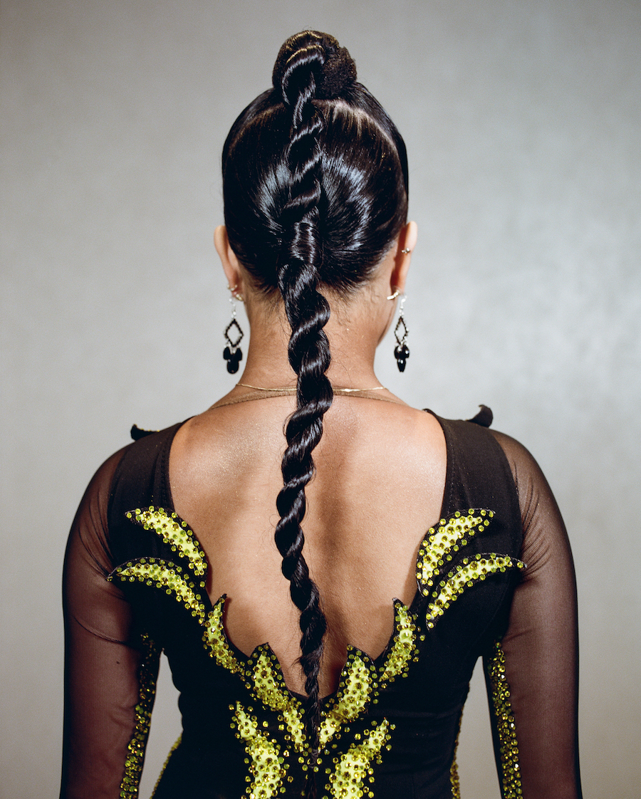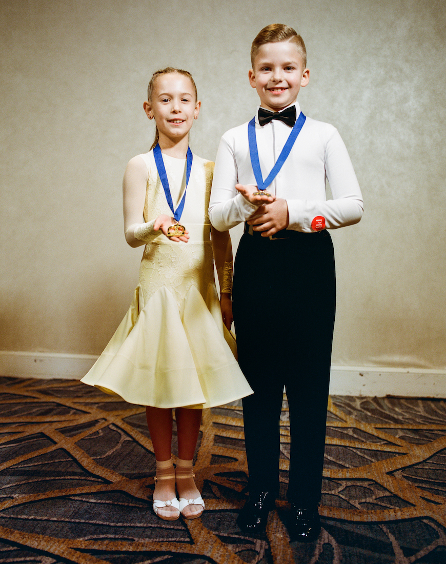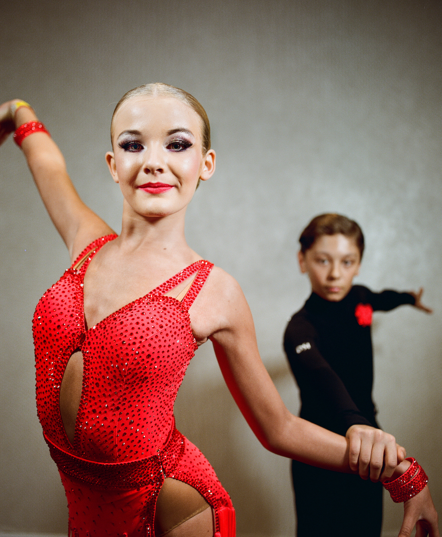 Offstage, the dancers are in a trance-like state of anticipation, moving in silence to music in their AirPods, warming up throughout the hotel. They don’t know what song the DJ will play for their routine until they step on the dancefloor. Upon entry into the ballroom, shiny rows of beaded gowns are being sold for small fortunes, for a second suggesting that you too could join in on this world of glitzed-out old-Hollywood glamour. Behind the black curtains, dozens of kid- and adult-sized Fred Astaires and Ginger Rogers twirl each other with the chutzpah you might have seen in Dirty Dancing. The mix of elegance and energy boils down to what the dancers call passion.