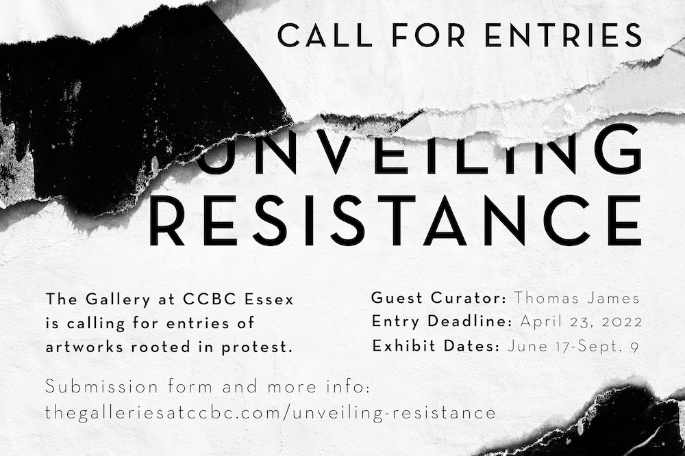 The Gallery at CCBC Essex is looking for artwork rooted in protest against injustices for the exhibition Unveiling Resistance, curated by Thomas F. James. We are accepting all forms of visual media, including but not limited to, sculpture, drawing, painting, digital art, film, animation, collage, photography, found object, performance (both live or filmed), and mixed media. For more information, visit thegalleriesatccbc.com/unveiling-resistance