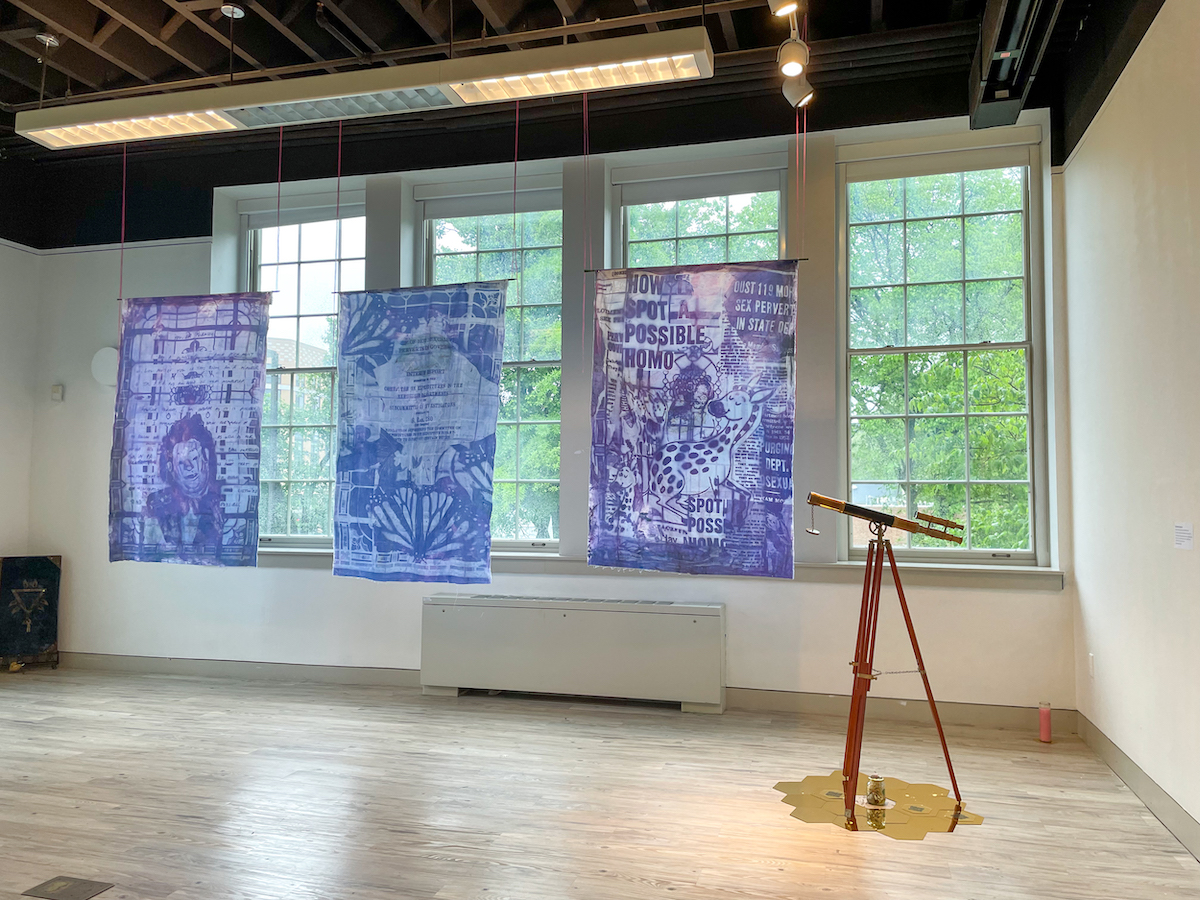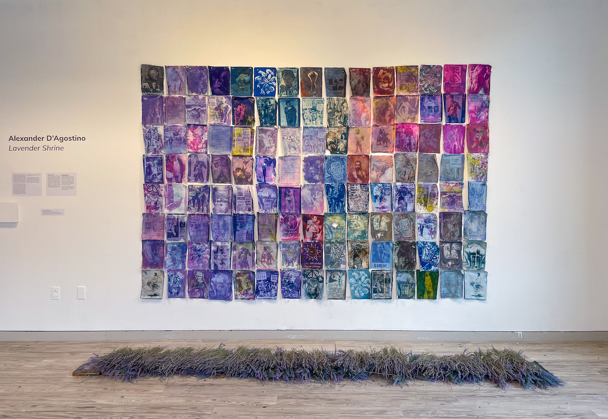 Dried lavender lines the ground on the left underneath “Queer Shroud Grid: Lavender Scare” (2022), a collection of 124 small (about 8.5-x-11 inch) cyanotypes with solar-fast dye on cotton. The images read like flashbacks, or partially erased memories, as they appear damaged and burned. Protests, medieval drawings, homophobic propaganda, caterpillars, and butterflies are depicted among the shroud grid, which ranges in color from soft pink to vivid indigo. Some imagery repeats, creating an overwhelming sense of a collaged struggle.