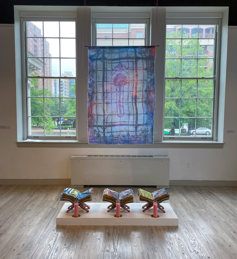Above the books is a large cyanotype of the Tiffany window, originally part of the Abbey Mausoleum, from the Arlington Arts Center’s performance room. D’Agostino purposefully defines and contextualizes his objects in spiritual mysticism: a grimoire is also known as a book of spells, while a shroud is a garment that is wrapped around a deceased person for burial. I find myself kneeling in front of grimoires to observe the imagery and am enveloped in the smell of lavender. The collection and presentation of these objects feel like an act of remembrance and processing of vicious historical acts.