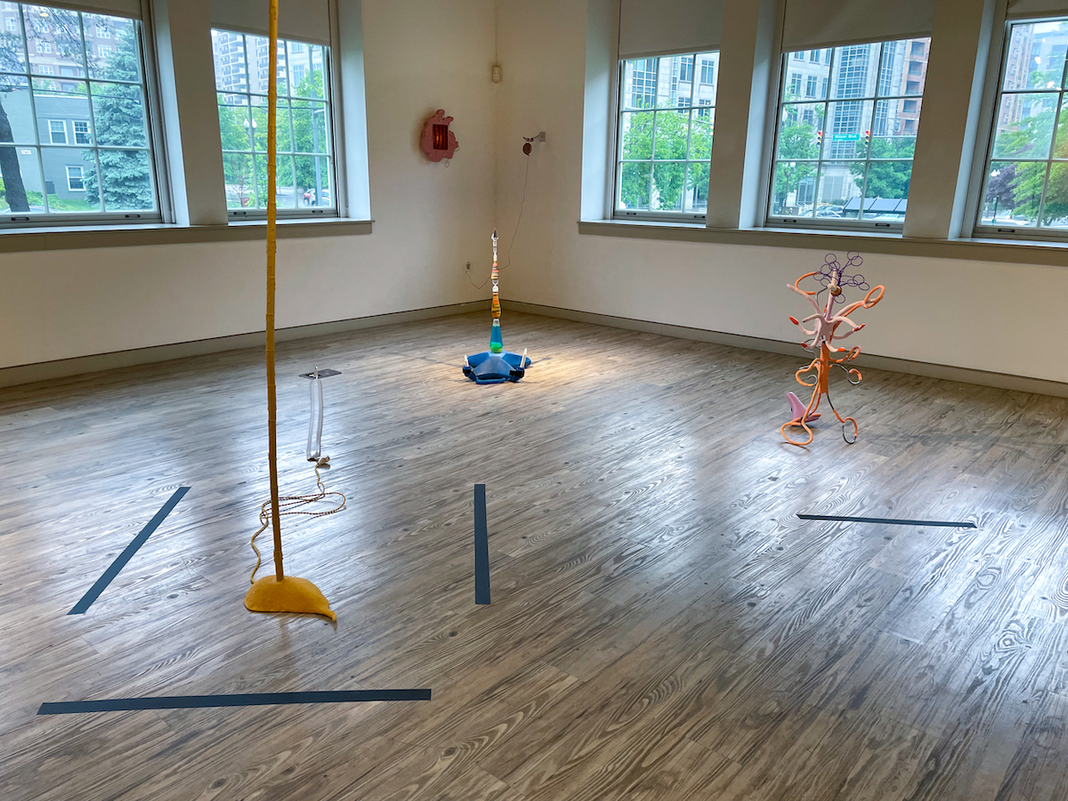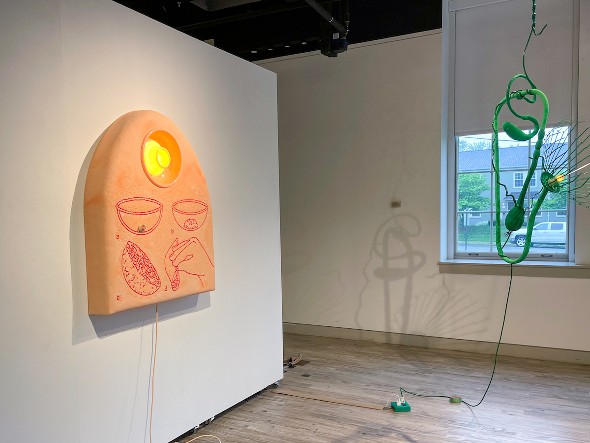 The texture and colors are reminiscent of a body, and what I thought at first was a menstrual cup turned out to be a diaphragm, the dome-shaped silicone contraceptive device. The play with the shapes and names is humorous, but also strange, as something very private is brought into a public setting and juxtaposed with eating. In a tongue-in-cheek manner, it points to what we desire and consume. The extension cord, the same orange, swivels to the ground and into the wall. This piece, like many of the others, pulls the viewer in with its exciting tactility and sound.