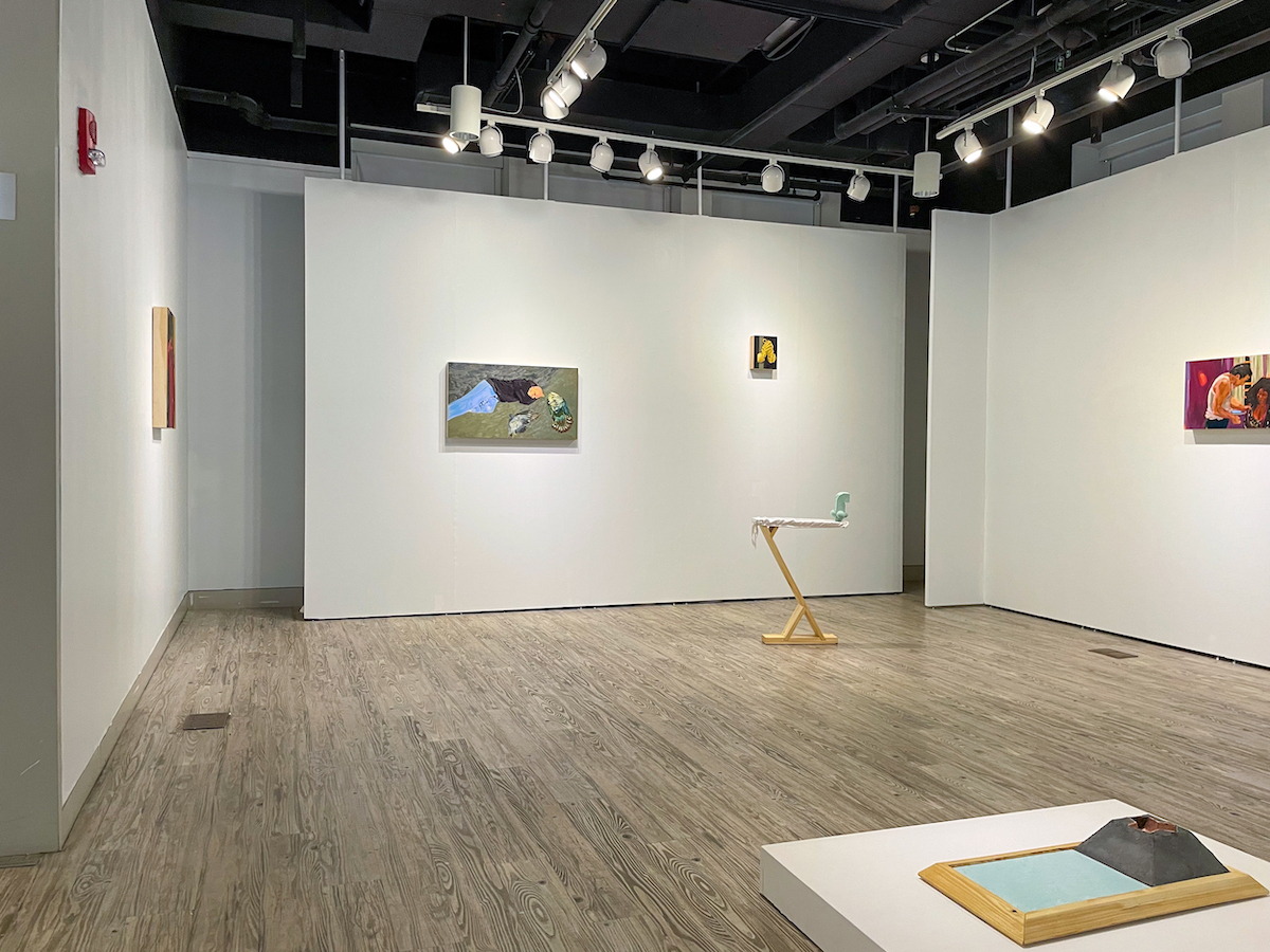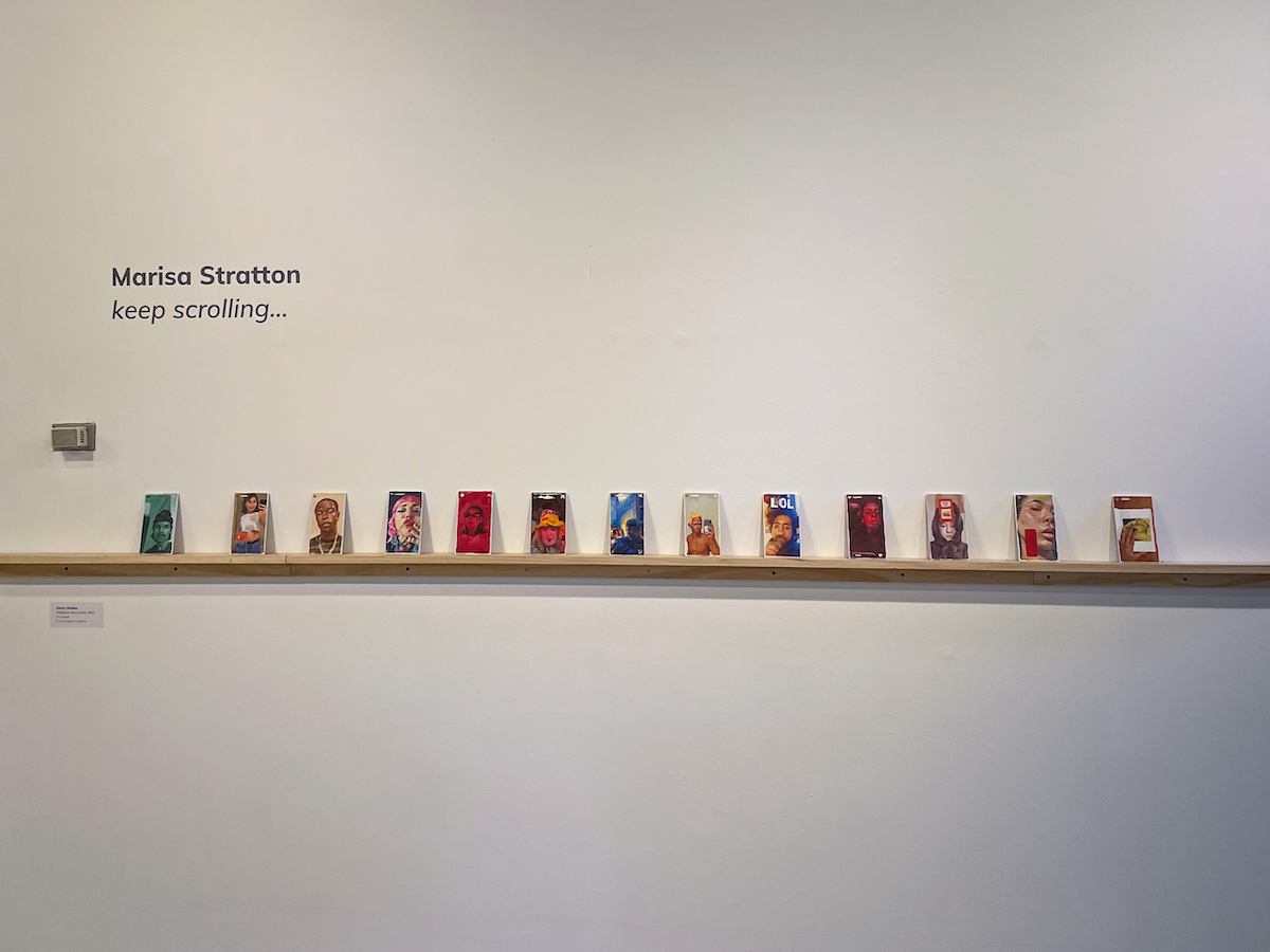 Marisa Stratton in keep scrolling… also presents figurative work, however more intimately as portraiture. Her sources are Instagram stories of everyday individuals she follows, grounding the works in the present. The paintings feel like an accumulation, as if the viewer was scrolling through the artist’s social media account. We live our lives through a conglomeration of images both through the physical and the digital. Our smartphone photos folder and our social media accounts are small bits of curated digital self-portraits. Here, the paintings are small, reflecting the digital handheld doorway. And Stratton acknowledges her models by titling each work with the users’ handles.