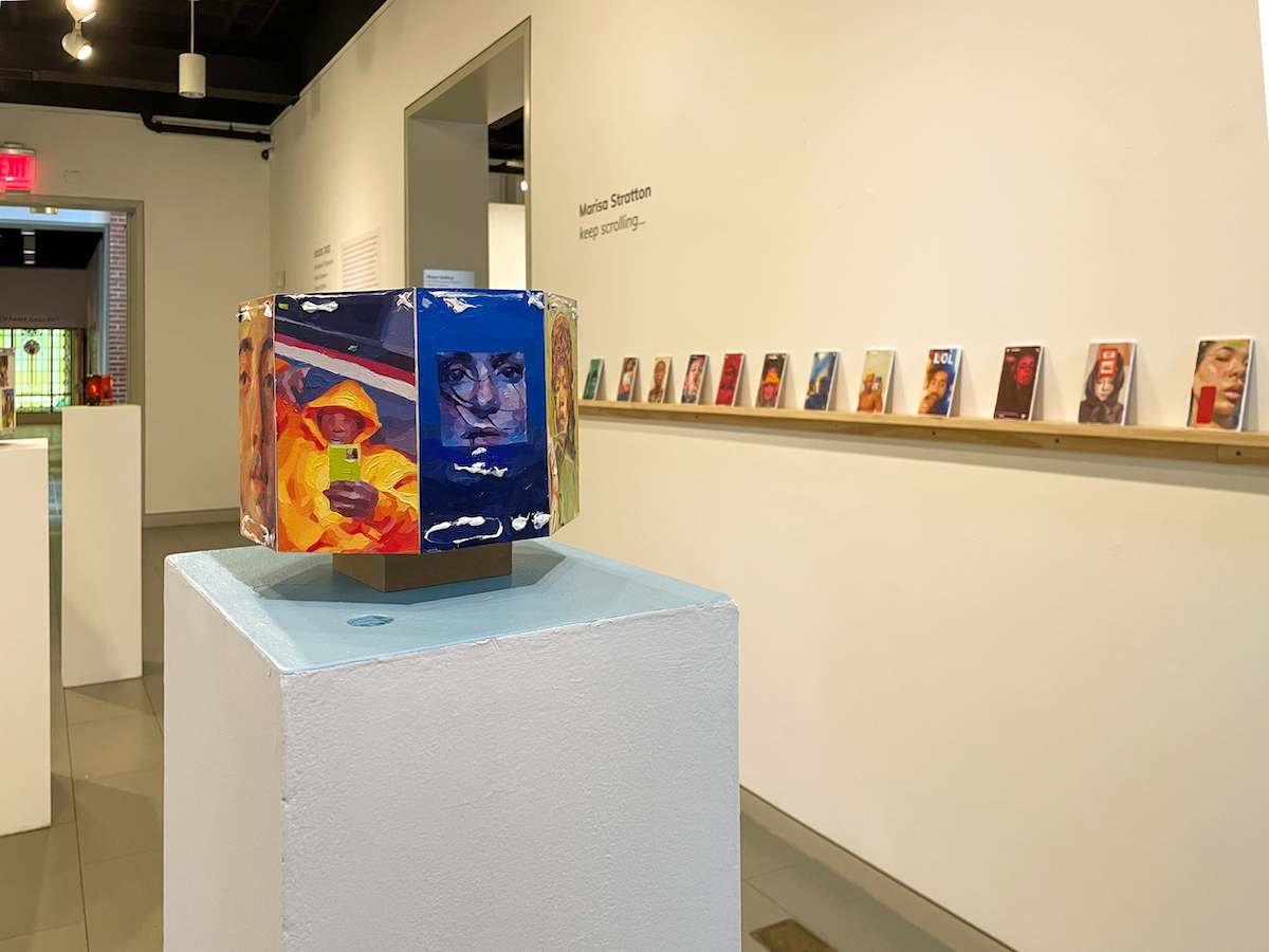Most of Stratton’s paintings are on wooden panels, layered horizontally in a row. Other paintings are arranged into octagonal and square forms, with the images painted on the inside or the outside. The mundaneness of the subject matter highlights the beauty in the everyday and elevates the Instagram story to a higher status. The posted stories are ephemeral self-portraits that only live for 24 hours online; thus Stratton’s project is an act of preservation.