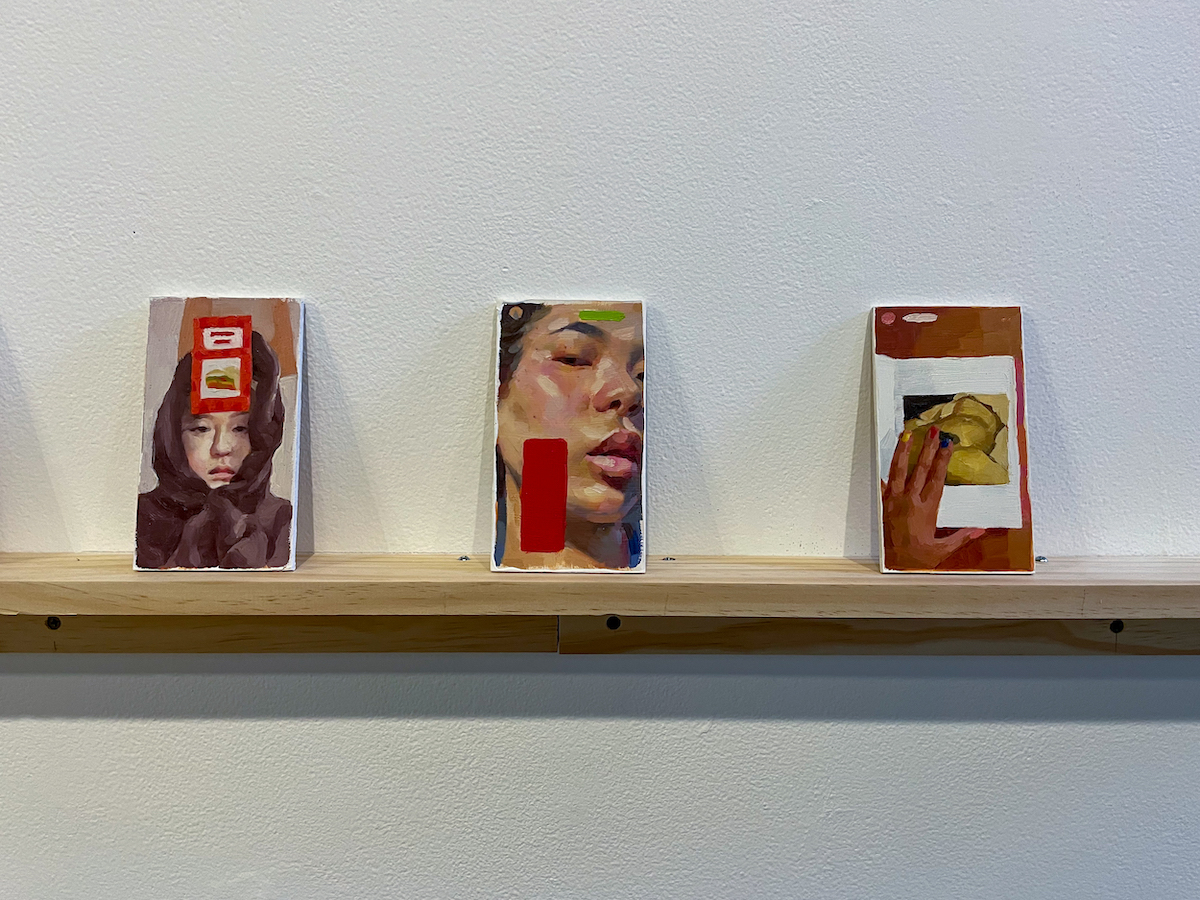 Stratton’s brushstrokes are luscious, with a soft haze, completely different from, yet reminiscent of, the glow of the screen. The source images are ephemeral snapshots of these users’ lives, but they are archived now in the traditional medium of oil paint. They feel sensual, capturing faces in their homes and cars. On the smaller wall section, I enjoy the combination of “@erinyahi” (2020), a woman in a black hoodie with an Instagram filter, followed by “@theoriginalmalia” (2020) an up-close view of a woman’s face, followed by “@m__a__y_a” (2020) of a woman’s hand holding a book open to Gustave Courbet’s “L’Origine du Monde (The Origin of the World).”