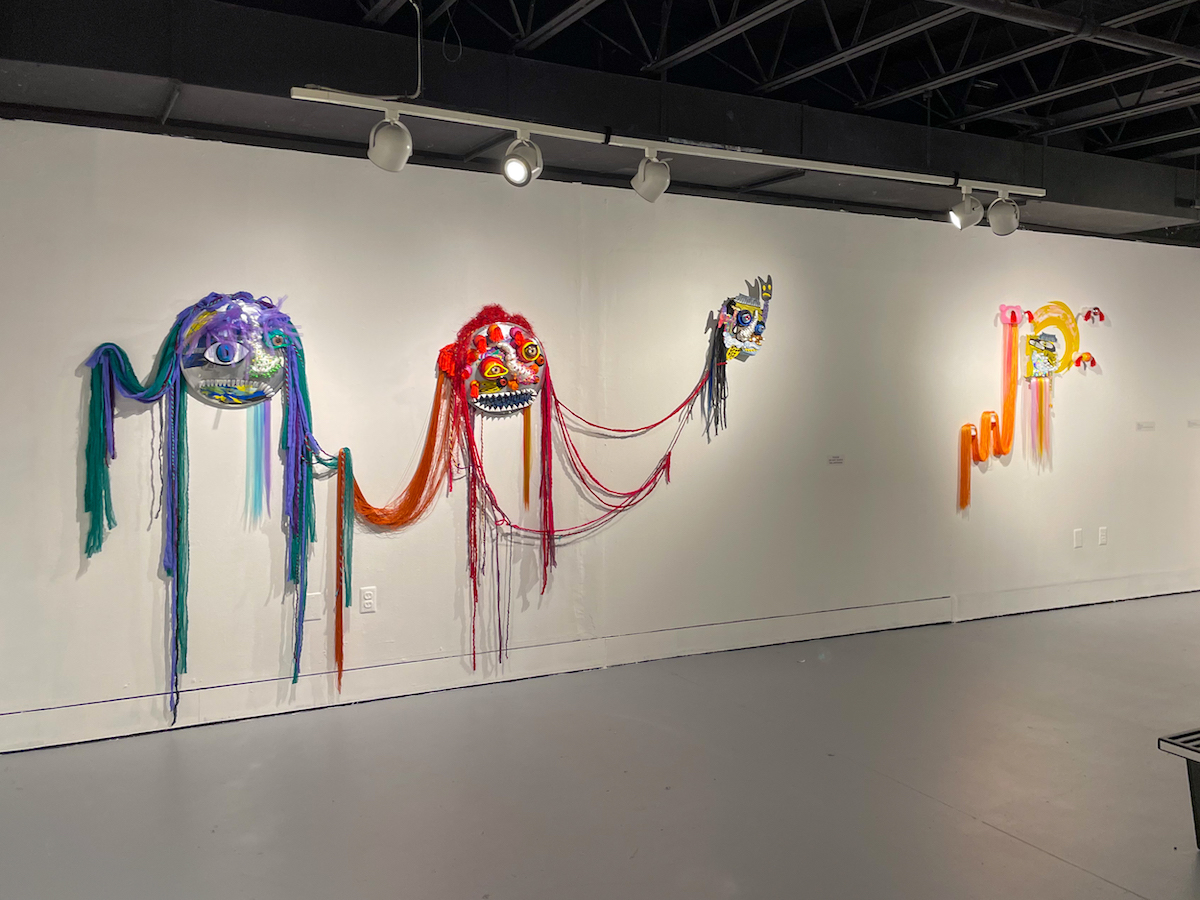 In “Imaginary Friends” (2020), she is inspired by traditional dance masks, but uses unconventional building materials such as polymer clay, large plastic eyes, synthetic fabric, and insulation foam. The vibrant reds and purples add playfulness to these large faces, and the plastic detritus of found objects in both cultures grounds it in a current moment. The anthropomorphized characters are spirited and very tactile, their insulation foam noses with beads are alluring. This sense of play and exploration stretches over to other works.