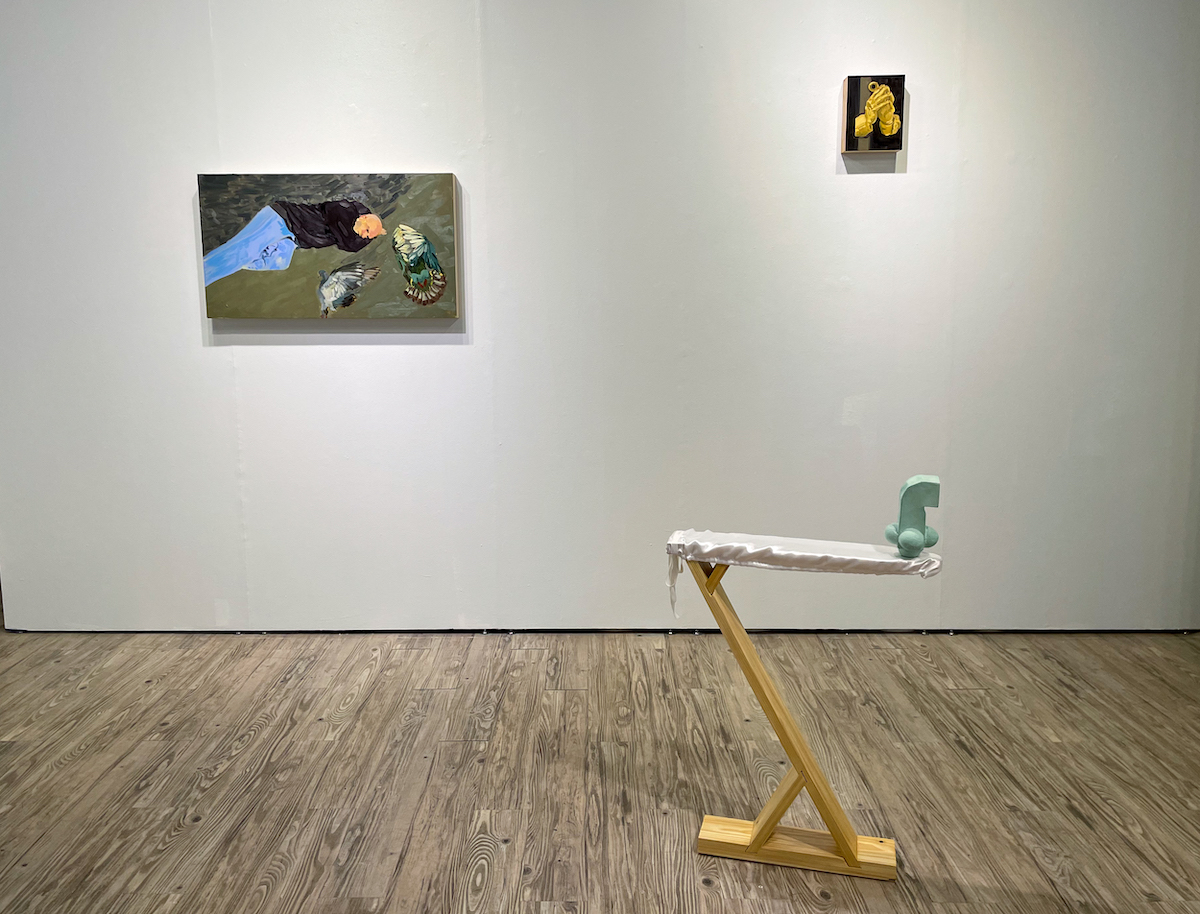The intensity of the characters contrasts with the other paintings that feel more somber, such as “Francis as Snow” (2022), a painting of a man lying on the sidewalk with two pigeons in front of him. Or “Pitched Hands” (2022), an image of gloved hands gathered in a pleading gesture, hung above eye level.