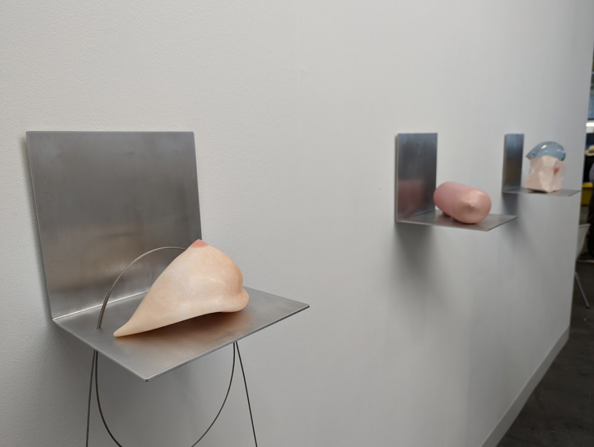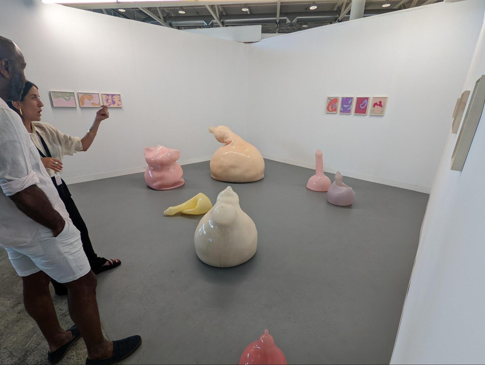 Anita Mucolli, who has a solo booth celebrating her Helvetia Art Prize win, definitely also takes the blue ribbon in the campy body horror category. Of all the lumpy, phallic/organic ceramics on view at the fair, hers are simultaneously the creepiest and cutest. The installation is populated by ceramic creatures that nod to H.R. Geiger’s “face-hugger” creatures from Alien, as well as cactuses, insect stingers, tentacles, dildos, and other things that could prick you (no pun intended). They’re lounging around a pool filled with a milky white liquid that glows when the sunlight hits it. This installation hits all the right notes as the grand finale of one very weird, very smart fair.