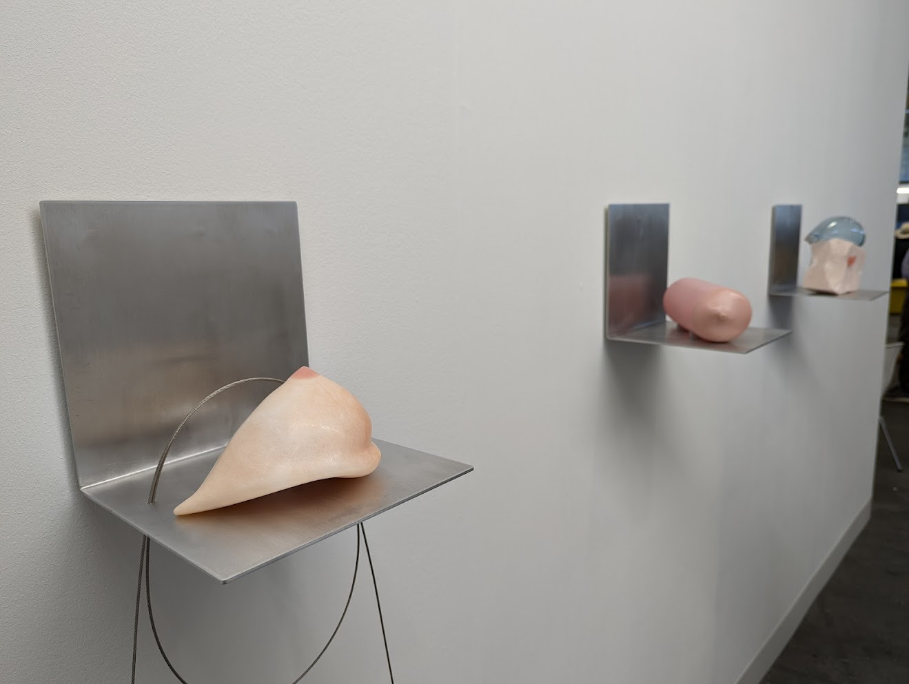 Maybe it’s all the microplastics sloshing around our bodily fluids, maybe it’s because we’ve all seen one-too-many Wish.com popup ads for terrifying-looking silicone sex toys, but there’s no denying that a full-blown body-horror trend is spreading like monkeypox, with artists making Cronenberg-esque allusions to the body in synthetic materials. In Nevine Mahmoud’s series “foreplays,” found objects are recombined with hard materials such as resin, glass, and carved stone to create deceptively supple, fleshy lumps. Most reference orifices or protrusions with penetrative potential, and are displayed on cold, clinical surgical steel shelving like specimens from a dissection. They’re really, really unsettling.