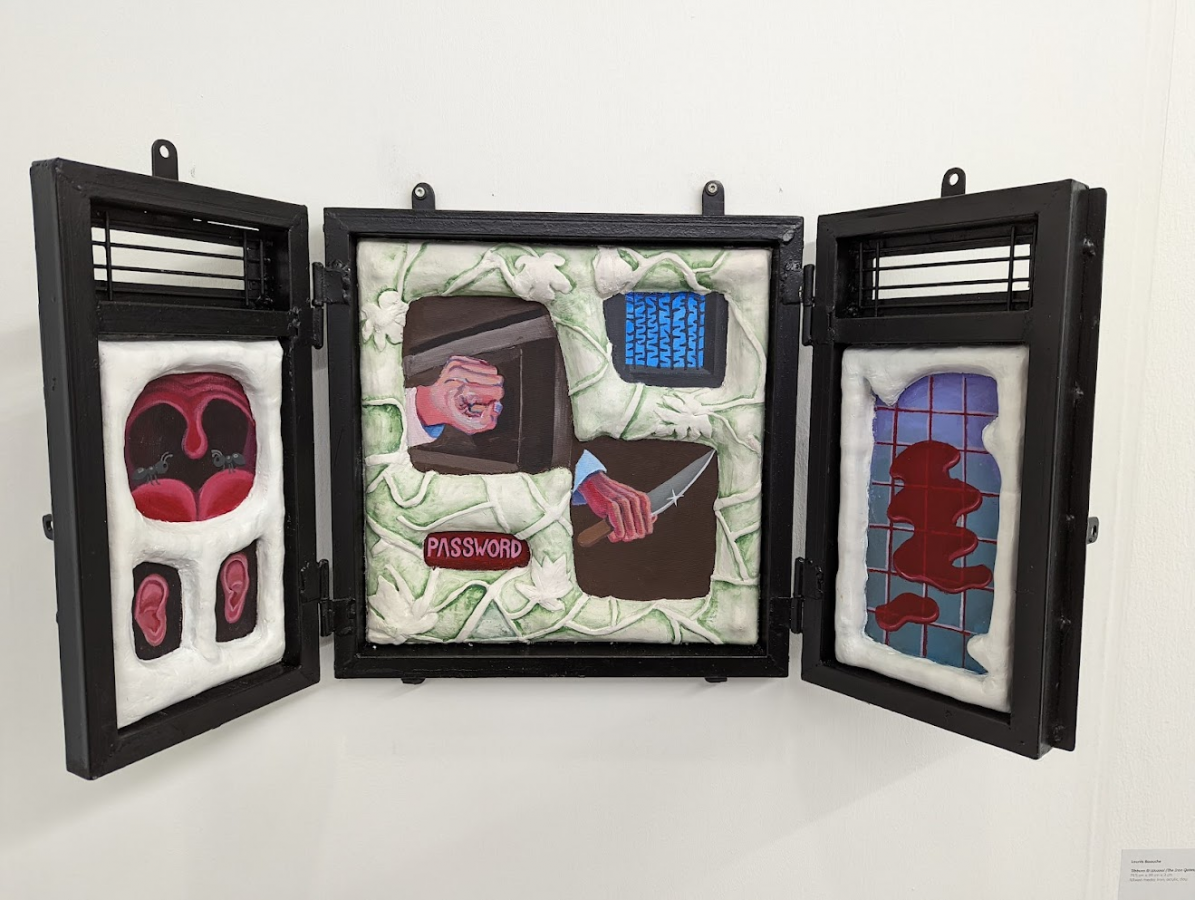 Sinister, anxiety-ridden, yet playful painting was also on display in Lounis Baouche’s solo exhibition presented by Algerian gallery rhizome. Baouche’s cryptic assemblages combine semi-narrative, surreal acrylic painting with found objects. “Tubbura N Wuzzal (The Iron Gates),” might be the most explicitly violent work diving into the gorey-terror-camp genre.
