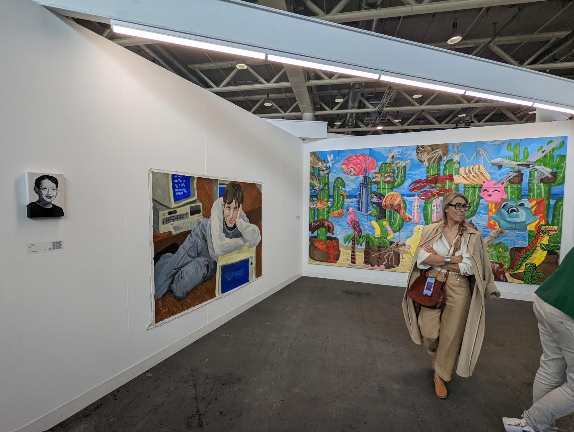 At Liste, most artists have swapped the grand, expressive brushstrokes and drippy canvases so popular a few years ago for tight, almost claustrophobic mark-making. Even in Vuk Ćuk’s larger canvases, the Serbian painter’s hand sticks to a restricted gestural vocabulary. These make for endearingly awkward paintings that complement their nerdy, nostalgia-tinged content—yearbook portraits, a young Bill Gates reclining against an early PC, and a larger-than-life video game landscape assembled from childhood pop culture references.