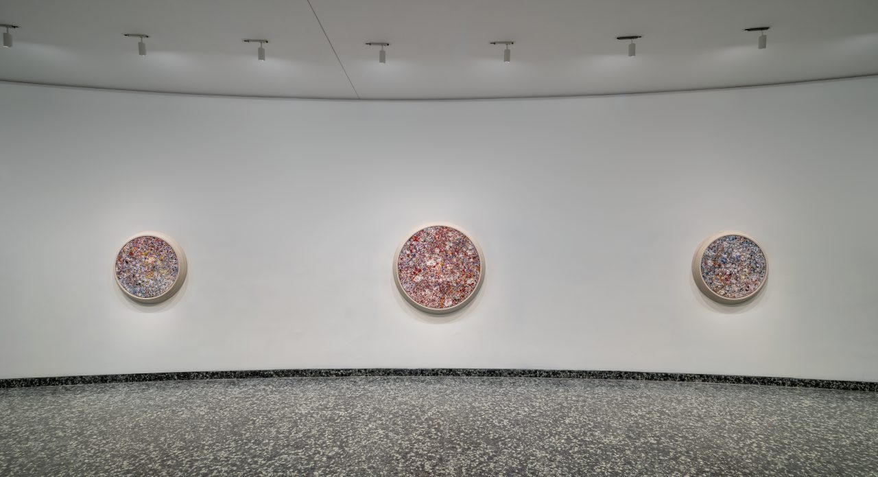 As each color palette sets the mood, each composition frames the conversation. What are our lived experiences if not jagged, layered, and nonlinear? Gilliam archives these textures by layering paints, altering their consistencies with thickening agents and studio scraps. According to the exhibition description, he blends these colors and uses a metal rake to reveal the layers beneath. Some are embellished with small beads of metal and employ finishing techniques like a netting overlay. A few of the tondos are sliced into quarters, supporting the idea that at times, to appreciate a whole, we must digest it in pieces.