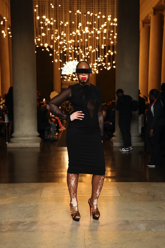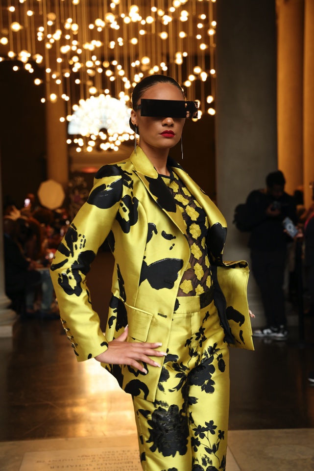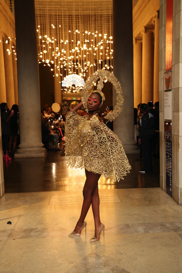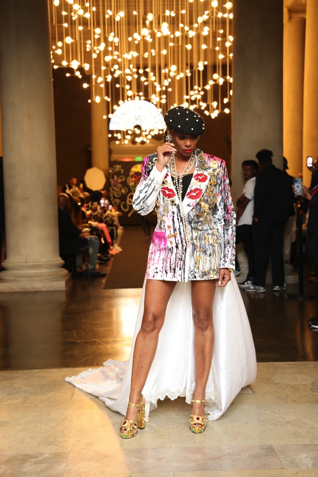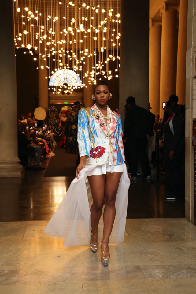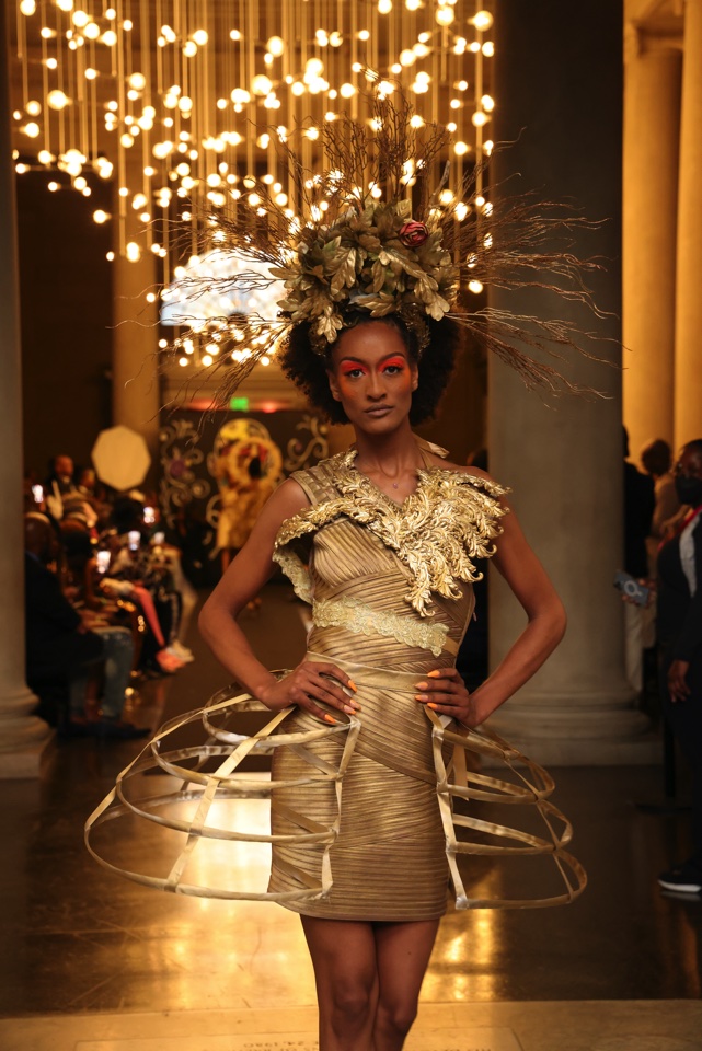 The works of Jody Davis were an elegant intersection of classic and contemporary, with dresses and pants suits balanced with edgy square glasses to make each wearer stand out. Her bold prints, layered tulle, and plaid patterns allured the eye, powerful but feminine. The line by Different Regard featured sustainable, zero-waste ready-to-wear bespoke pieces, for weddings and special occasions. Their garments displayed abstract pastel fabrics, maroon leather, asymmetrical necklines, black and white patterned block sets, truly a look for every occasion. And Evette Monique Couture’s models wore golden radiant sculptural pieces with black lace, puff sleeves, and feather detail with crowning headpieces, appearing like goddesses, both regal and modern. These designers understood the assignment!