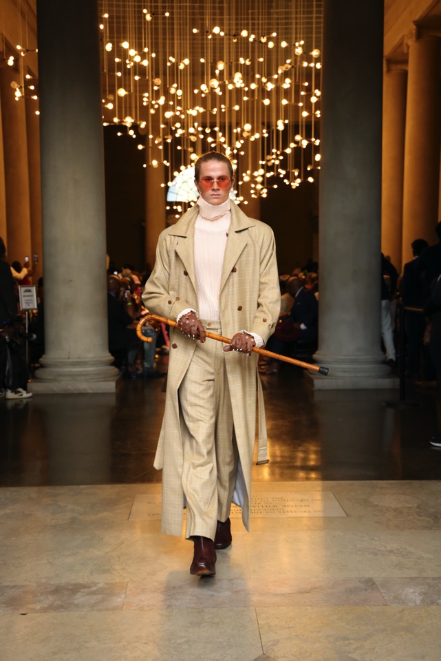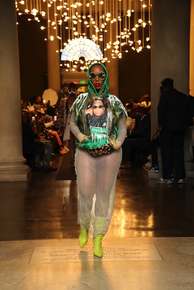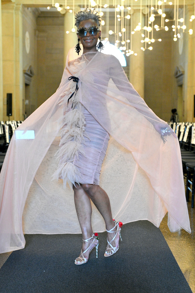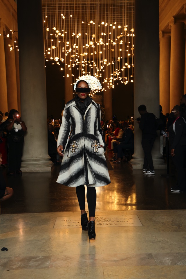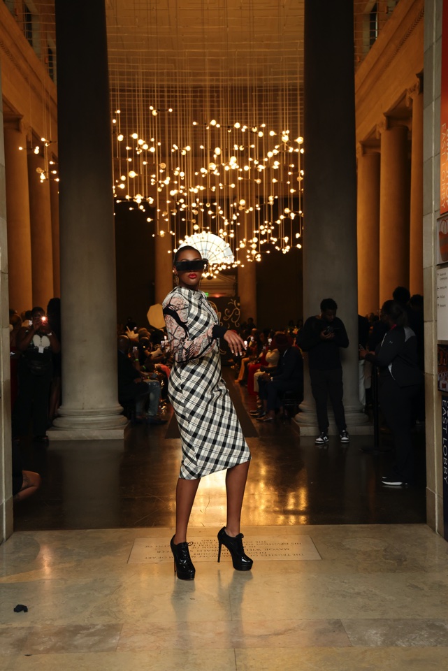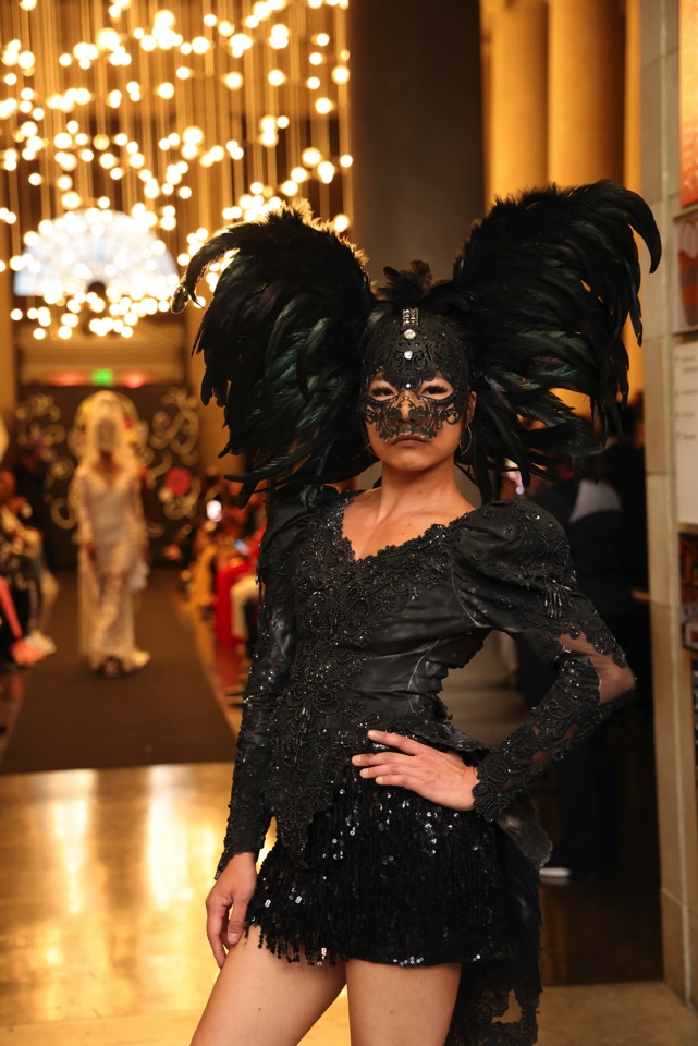 The works of Jody Davis were an elegant intersection of classic and contemporary, with dresses and pants suits balanced with edgy square glasses to make each wearer stand out. Her bold prints, layered tulle, and plaid patterns allured the eye, powerful but feminine. The line by Different Regard featured sustainable, zero-waste ready-to-wear bespoke pieces, for weddings and special occasions. Their garments displayed abstract pastel fabrics, maroon leather, asymmetrical necklines, black and white patterned block sets, truly a look for every occasion. And Evette Monique Couture’s models wore golden radiant sculptural pieces with black lace, puff sleeves, and feather detail with crowning headpieces, appearing like goddesses, both regal and modern. These designers understood the assignment!