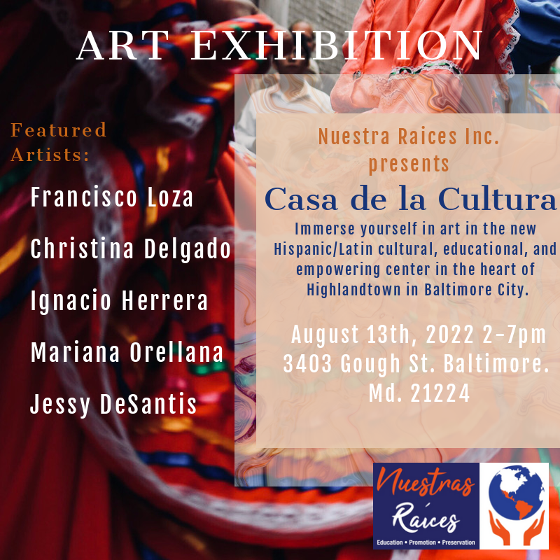 A group exhibition for the inauguration of Nuestras Raices Inc “Casa de la Cultura” gallery space and cultural center will be held in the Highlandtown neighborhood of Baltimore City. Known for its rich latin culture, a gallery space by and for latin artists will be available to amplify artists who have been historically overlooked or without opportunities to showcase their work in the arts community in Baltimore.
