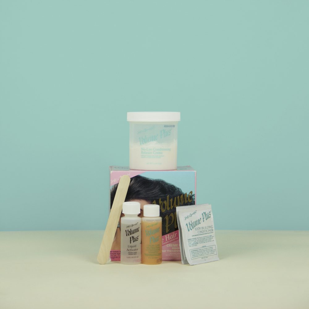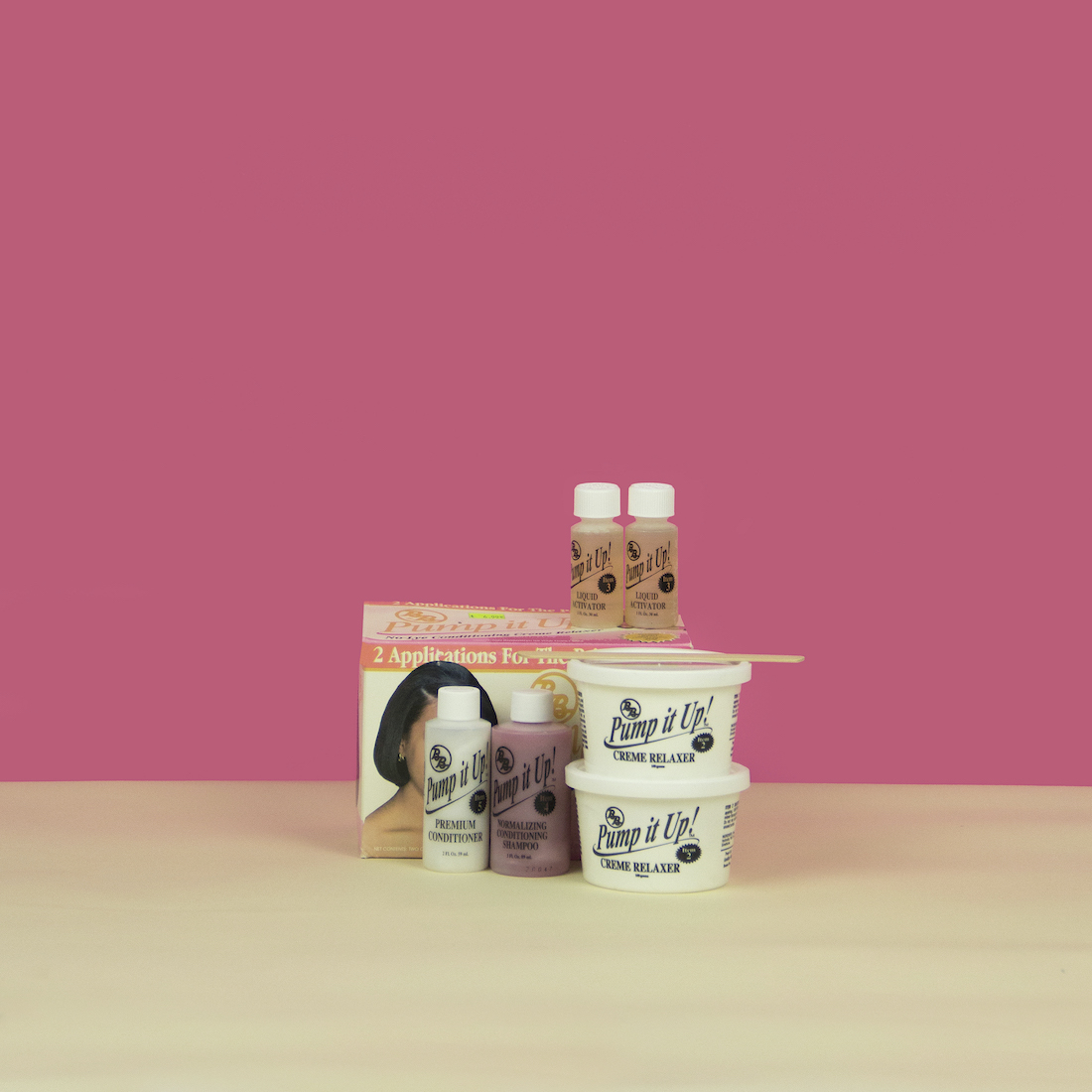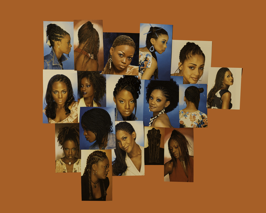The familiarity of Brown’s work is a testament to her ability to tap into the collective consciousness of Black women who share similar rituals across the diaspora. In early 2022, images from the series Façade Objects were included in Dispersive Archives Volume 2, curated by Joy Davis at Eubie Blake Cultural Center, hanging next to Brown’s 2021 video piece which featured a step-by-step guide to chemically relaxing hair. In each image, the contents of various perm kits are arranged in front of the boxes, obscuring the Black models’ faces and implying their beauty would only become visible after using the kit.