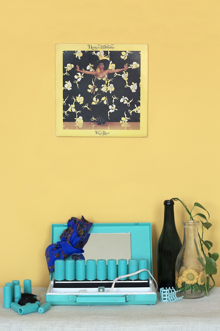 Black pop art iconography, like Jet magazine’s coverage and advertisements reflecting the 1960s Black is Beautiful movement and the Natural Hair Movement of the 2000s, are all influential to Brown’s photographs. If Nostalgia Were Colored Brown explores Black womanhood and girlhood and references white eurocentric standards of beauty that told Black women to straighten their hair and the hair of their daughters. In Sophisticated Lady, a vintage hair dryer covers the top corner of a Natalie Cole record like a crown. The singer smiles, her dress color a similar tone as the object, and in front of the record, a pair of glasses nests against a plastic comb. This image, like others in Brown’s oeuvre, could be a snapshot of the un-airconditioned beauty shop that I used to go to on the Southside in Fort Worth.