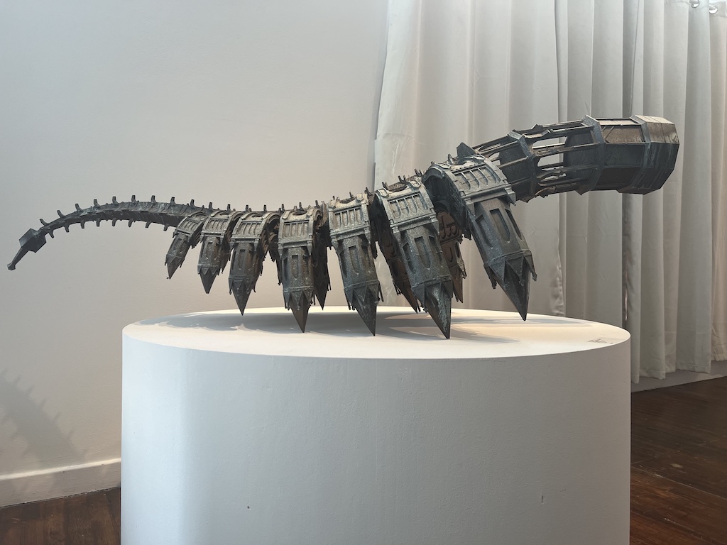 Geoffrey Krist’s “Church Centipede (Ecclesia Scolopendra),” a 3D-printed sculpture from PLA with oxidizing paint, feels like bent reality. Architectural elements of a church morph into the form of a Scolopendra, a genus of large tropical centipedes that are carnivores and venomous. The creature feels like a monster out of a dream enveloping its inhabitants.