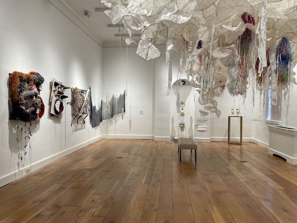 Changing and blooming over one’s life and within the self is celebrated and acknowledged in Kathy Marmor’s and Penny Rheingans’ “Beyond Midlife: Unspooling,” a collection of four large wall-hanging fiber sculptures that combine hair, lace, foam, and wood, with woven and stitched elements and spools of yarn that are in one instance suspended as plum bobs and in another reminiscent of breasts. The instsallation feels tumultuous, urgent, and at times unraveling as one’s body changes. Materials that are traditionally considered domestic and feminine are used as a visceral exploration of the endurance of the female body in the face of time.