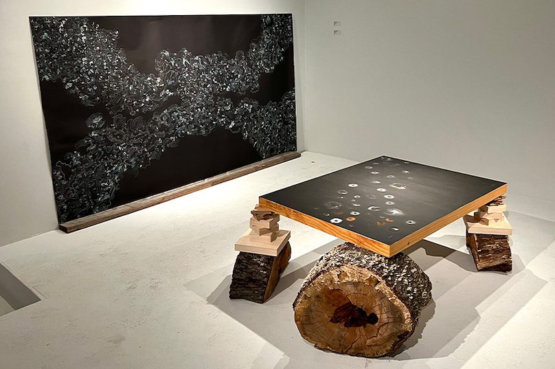 Candice EH Cramer’s sculpture and drawing also have disparate elements, such as ashwood logs with mushrooms, milled lumber, spore prints, and ink that come together to form a bigger, whole network. Her large ink drawing “You Can’t Kill Me In a Way That Matters” is composed of mushroom spore prints and fluid lines that spread out from the center into four paths or arms on black paper, like the mycelial network which it visually alludes to. The title and the form suggest a deeper web that isn’t always visible and cannot be destroyed simply, as multiple nodes will continue to persist.