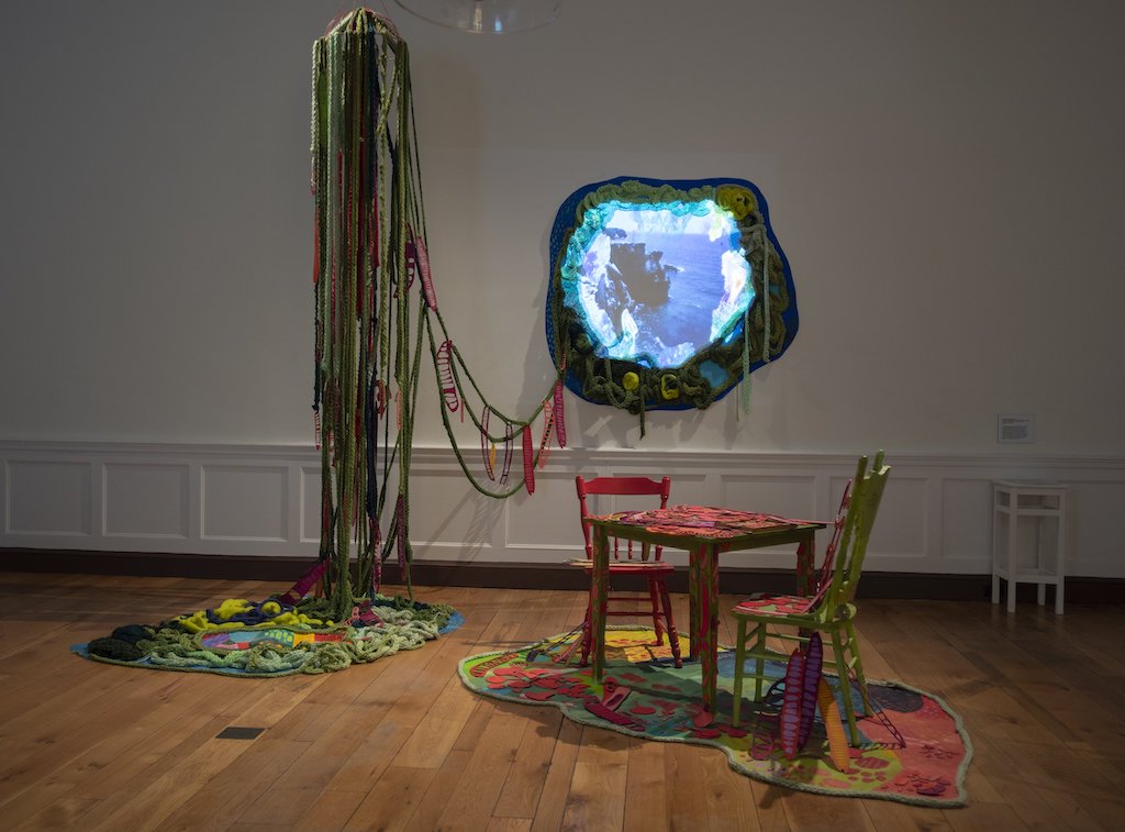 Foster Reynolds-Santiago explores a spiritual connection between Puerto Rico’s natural landscape and transgender inhabitants in “Transgender Euphoria: Puerto Rico’s Queer Exaltation.” The multi-sensory installation includes hanging knitted fabrics resembling the Flamboyán tree, a desk and chairs with abstracted images reminiscent of the fruit of the tree, a figure with scars on their chest as an allusion to gender-affirming surgery, and a stop-motion animation projection, layered with a multi-generational conversation with a melody of crickets and frogs.