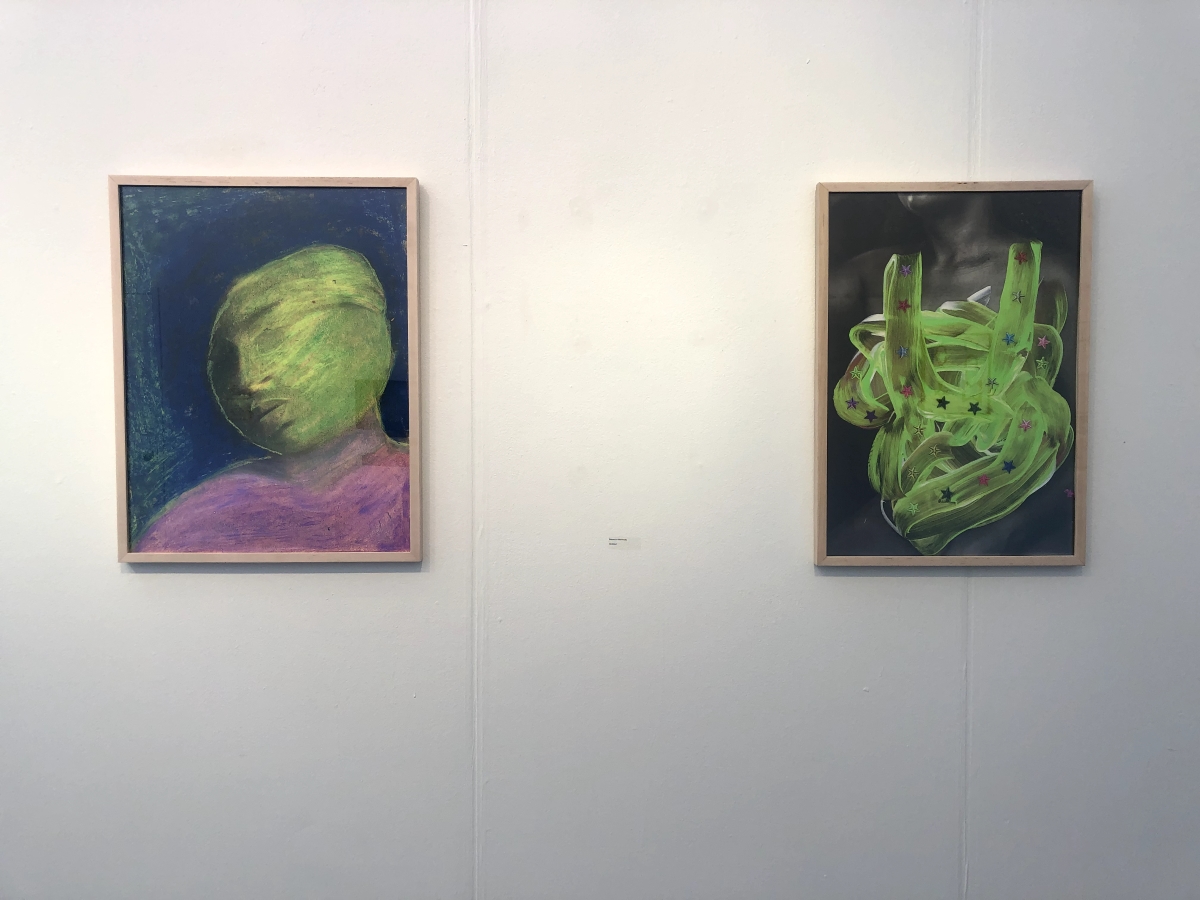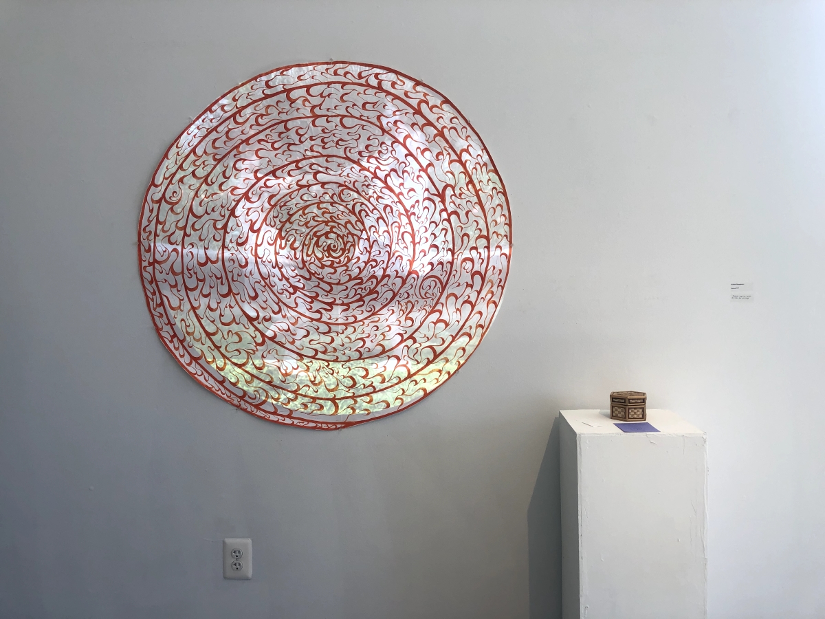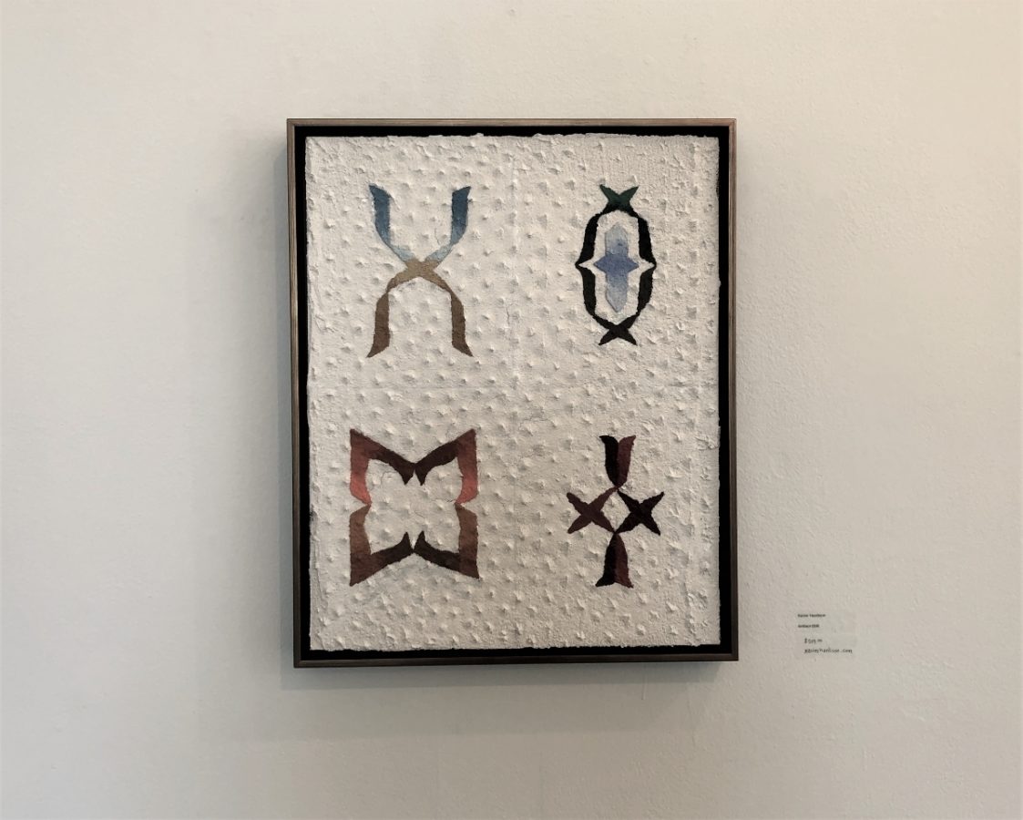 Three-dimensional textures and desaturated color palettes are central to Xavier Hardison’s “Artifact 058.” Made with acrylic and sand on board, the piece depicts four abstract interpretations of the letter X, an eye, a butterfly, and a cross. Organized in pairs, the shapes feel harmonious due to their sharp and precise outlines and how each shape incorporates x’s into its design—a subtle nod to the artist’s first initial. But each shape’s unique color palette gives them a sense of individuality: For example, the butterfly’s outline is composed of burgundy, oranges, and brown, while the letter X transitions from cyan blue to beige and ends in light brown.