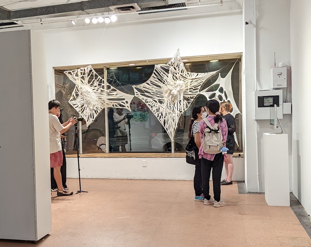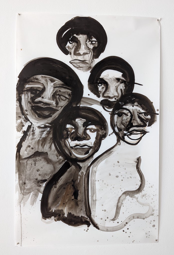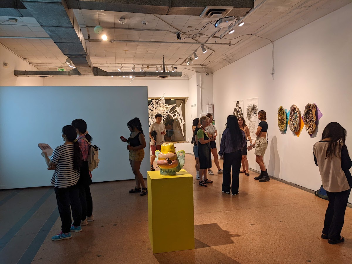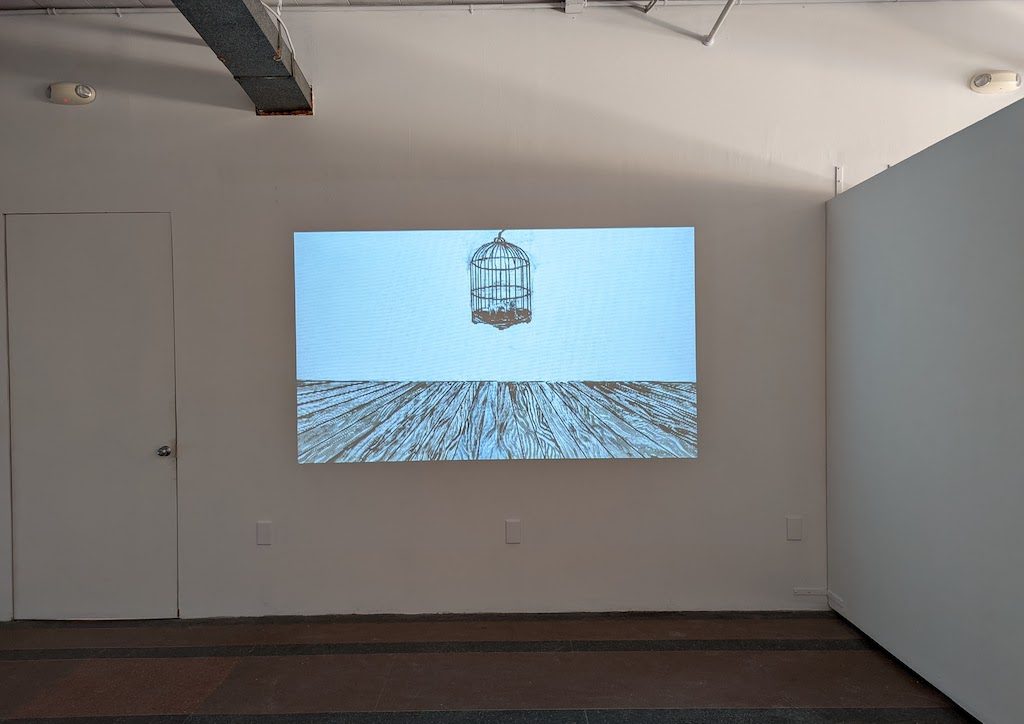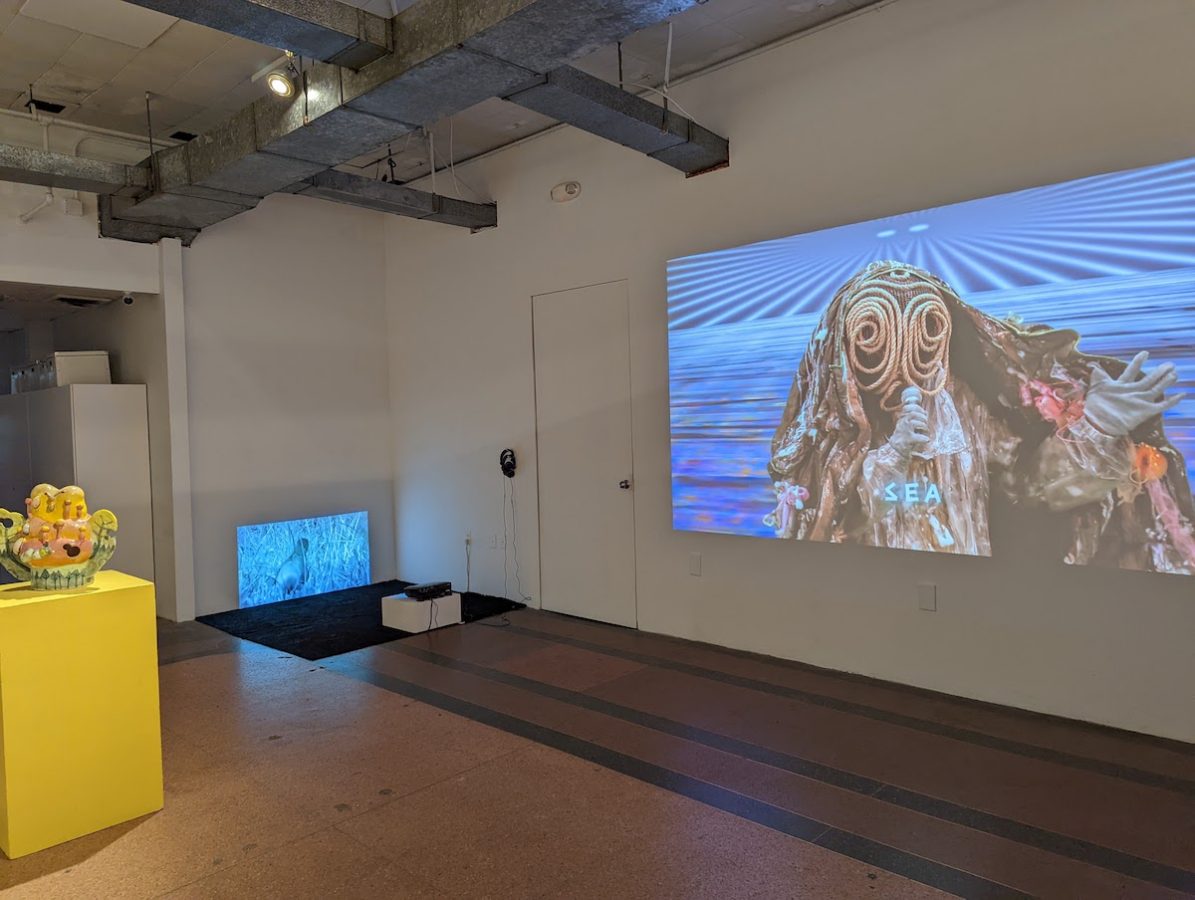 Lehna Huie’s ink-on-paper portraits, “The Moment of Time” (No. 1, 2, & 3), bring a strong element of humanity to the space. Huie uses bold linework and splatter techniques to depict a group portrait of unidentified individuals who share the same tranquil expression. “The Moment of Time” No. 1 and No. 3 are limited to only including the individual’s faces, while No. 2 includes the abstract silhouette of those in the foreground. The series asks viewers to pause and reflect on the people who are present in the moments of our lives that leave an impact on us. As the only black and white drawings, Huie’s portraits visually round out the exhibition, a subdued counterbalance to brightly colored sculptures and two-dimensional animation by Haochen Zhao and Haomin Peng, respectively.