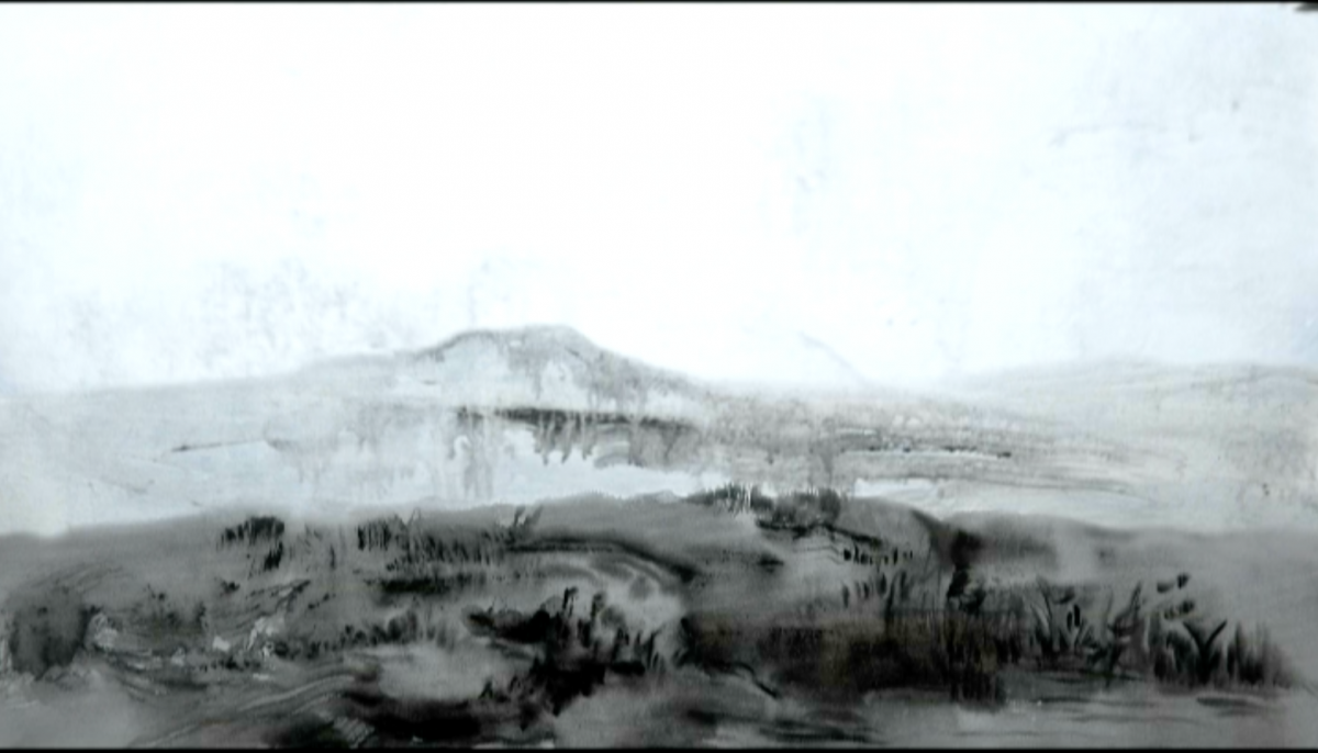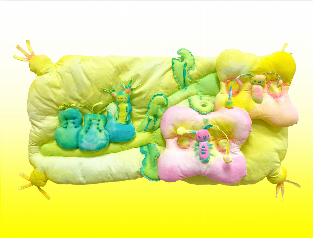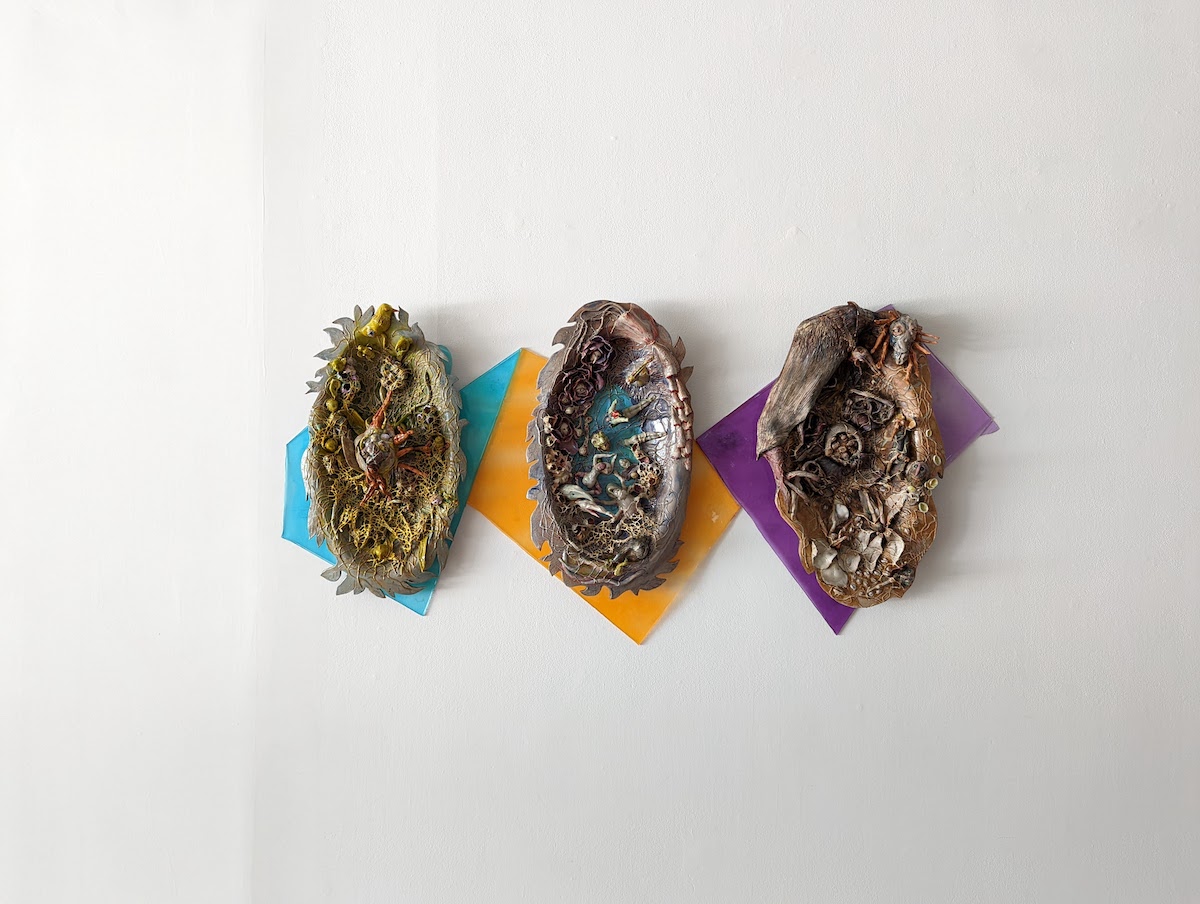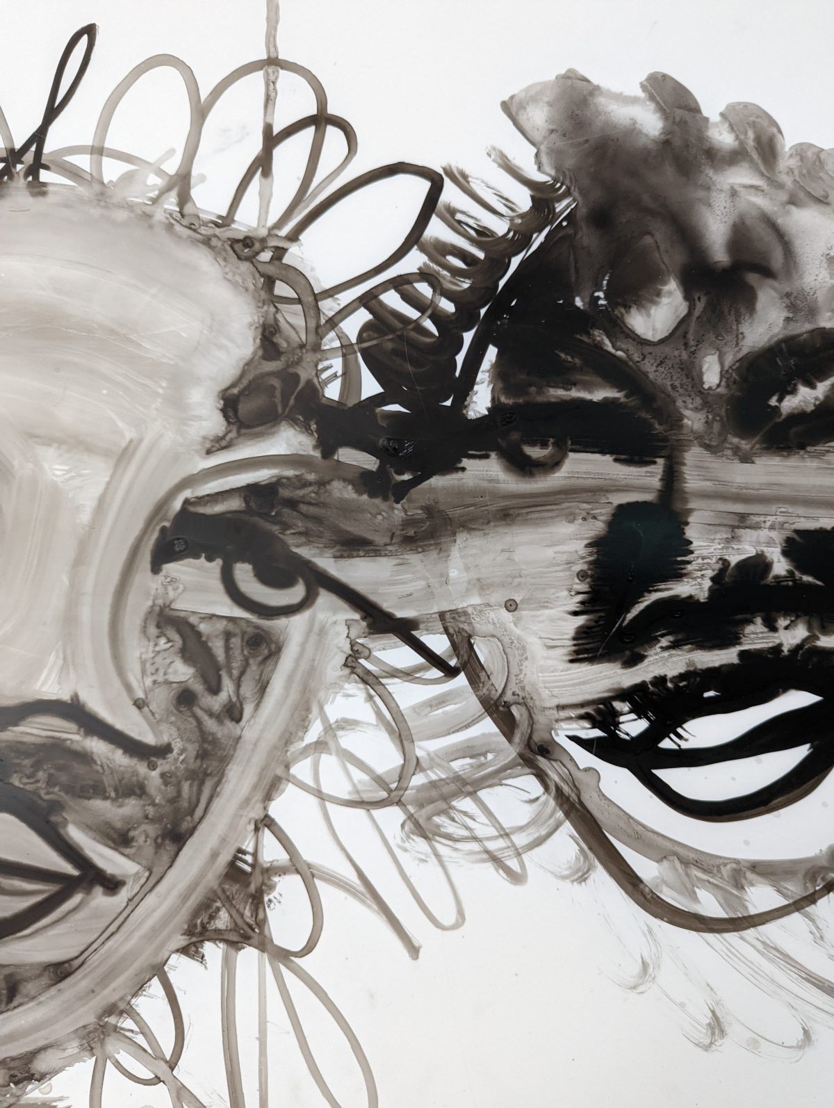 Lehna Huie’s ink-on-paper portraits, “The Moment of Time” (No. 1, 2, & 3), bring a strong element of humanity to the space. Huie uses bold linework and splatter techniques to depict a group portrait of unidentified individuals who share the same tranquil expression. “The Moment of Time” No. 1 and No. 3 are limited to only including the individual’s faces, while No. 2 includes the abstract silhouette of those in the foreground. The series asks viewers to pause and reflect on the people who are present in the moments of our lives that leave an impact on us. As the only black and white drawings, Huie’s portraits visually round out the exhibition, a subdued counterbalance to brightly colored sculptures and two-dimensional animation by Haochen Zhao and Haomin Peng, respectively.
