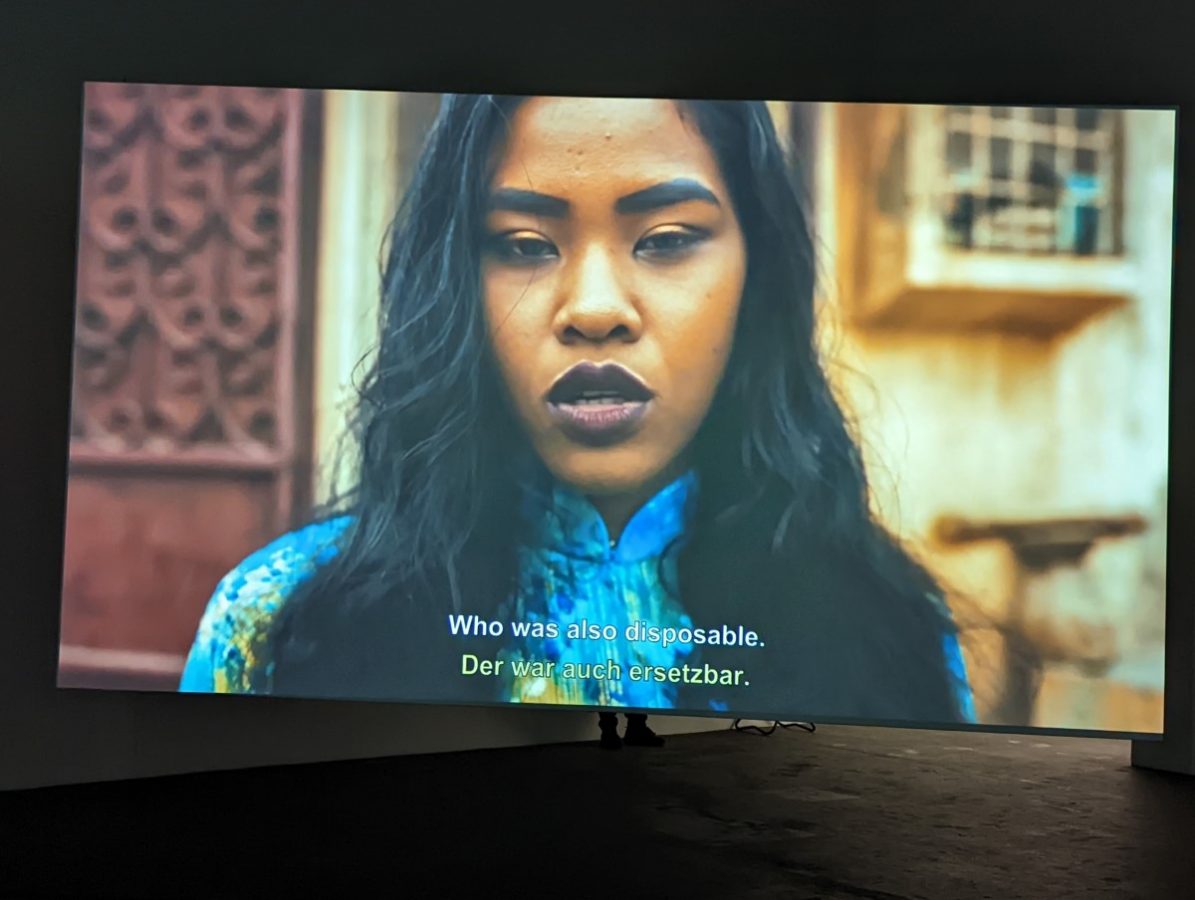 I stood paralyzed in front of two side-by-side displays at the KW Institute for Contemporary Art. To my right, a group of people sat silently staring at a screen, chins resting on furtive fists, watching looped grainy surveillance footage of detained asylum seekers at the US/Mexico border. The refugees in the video shivered and huddled together, slowly inching around a freezing cell, trying to keep warm under thin silver space blankets—dehumanized and reduced to a visual uncomfortably evocative of old black-and-white documentation of Warhol’s “Silver Clouds.” To my left were the daunting blocks of didactic text and archival images I had just diligently read, outlining the mass rape of German women by allied soldiers in the ruins of postwar Berlin in the weeks following the city’s “liberation”.