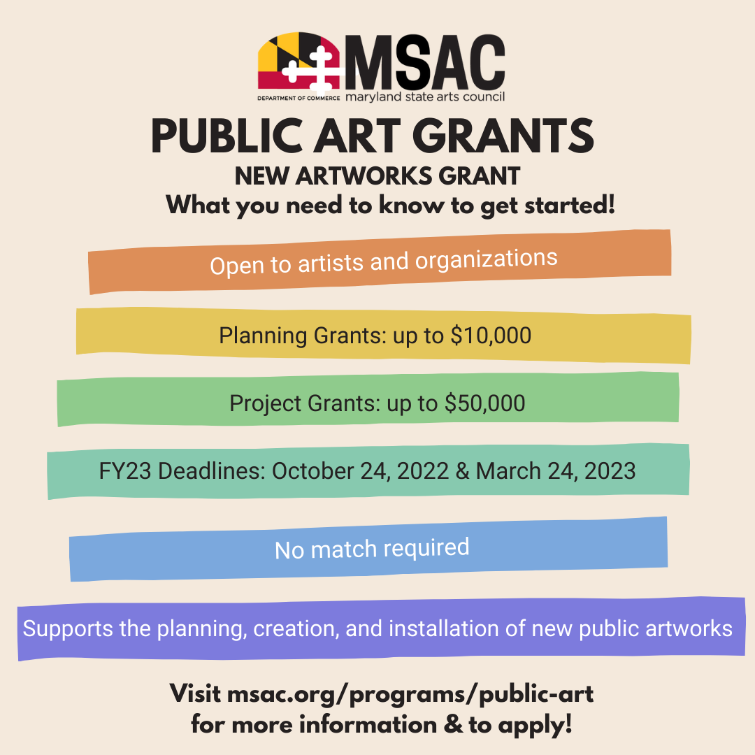 The Public Art Across Maryland (PAAM) New Artworks Grant from the Maryland State Arts Council offers funding to artists and organizations to support the planning, creation, and installation of new local public art projects.