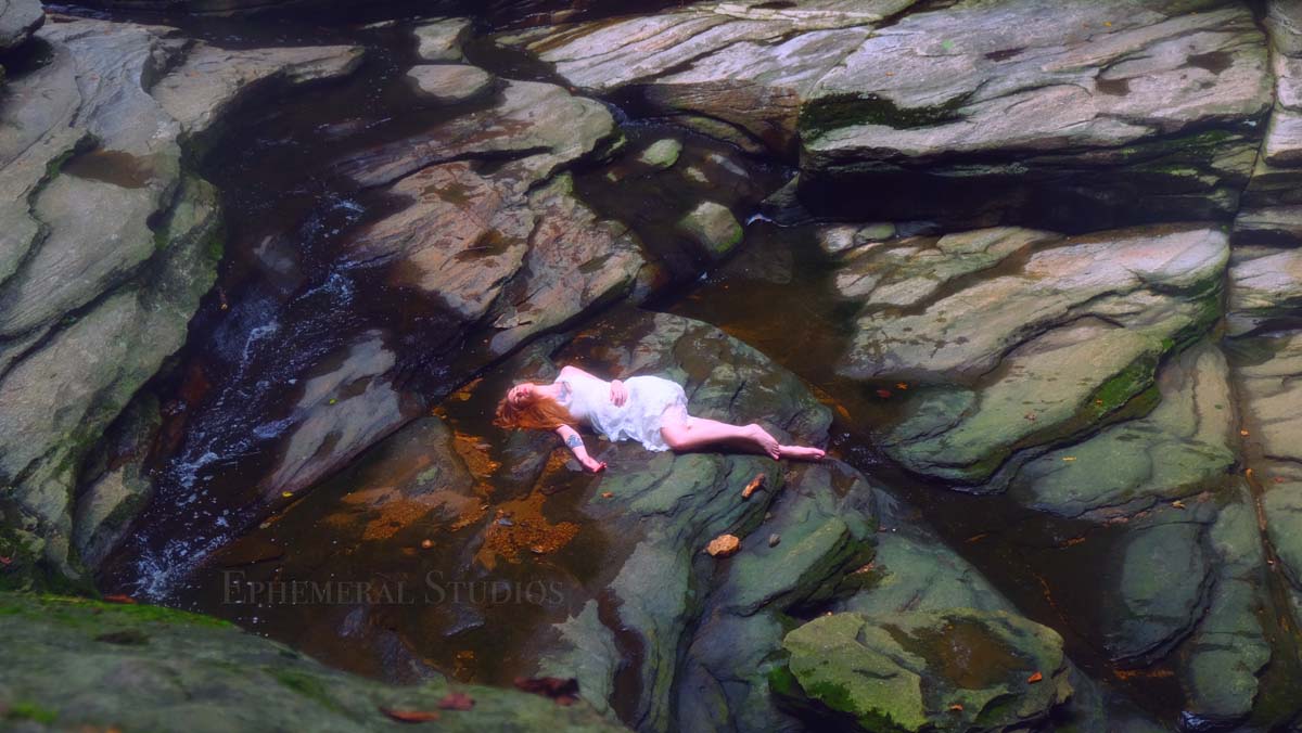 “A Faery Haven” depicts a woman sitting on a rocky river bank with a small waterfall in the background, clearly deep in the forest. She wears her hair down and a lace white dress. Her foot grazes the river’s surface as she looks up at the sky peacefully. The woman’s ethereal look and languid pose make her appear part of the natural landscape of the scene, fully belonging amongst the ferns and rocky mountainside as she embodies her role of “faery.”