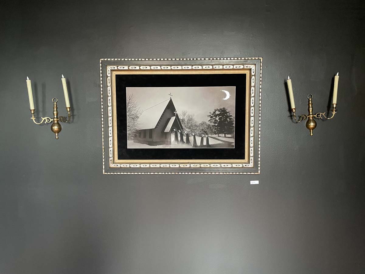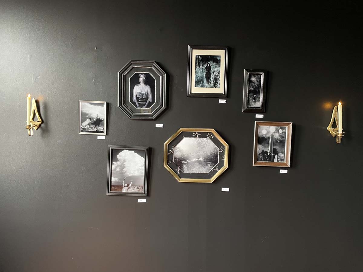 Upon entering the multi-room gallery, visitors first encounter Rituals. The space resembles a Victorian waiting room, with black-painted walls, candlelight wall sconces, and an intricate ottoman. The exhibit’s black-and-white photography collection is displayed around the room similarly to how a household would display family portraits and artwork. The elaborate, mismatched frames add to the exhibit’s immersive experience, where visitors step into a private, sacred space. Each photograph further adds to the collection’s line of storytelling and shares similar visual elements. Jane plays with the concept of light and shadow to portray eerie images of desolate, haunted places, and the in-between spaces of life and death.